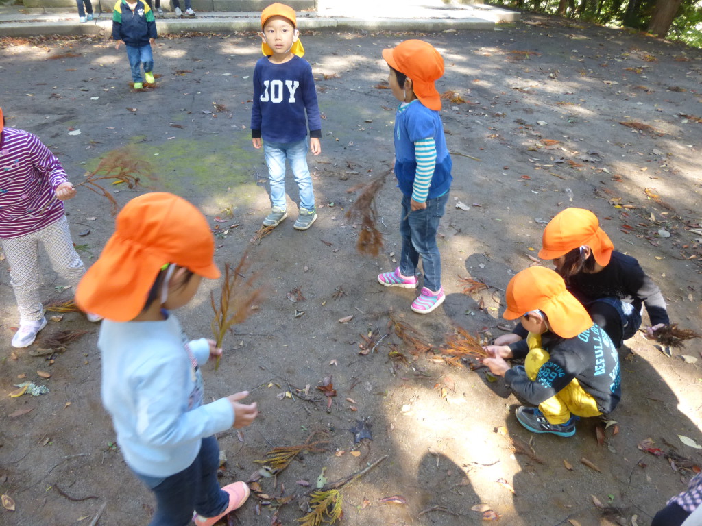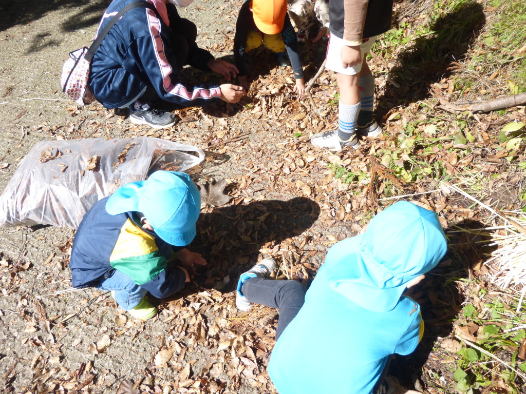 落ち葉を見つけた子ども達、小さな手で一生懸命集めます。