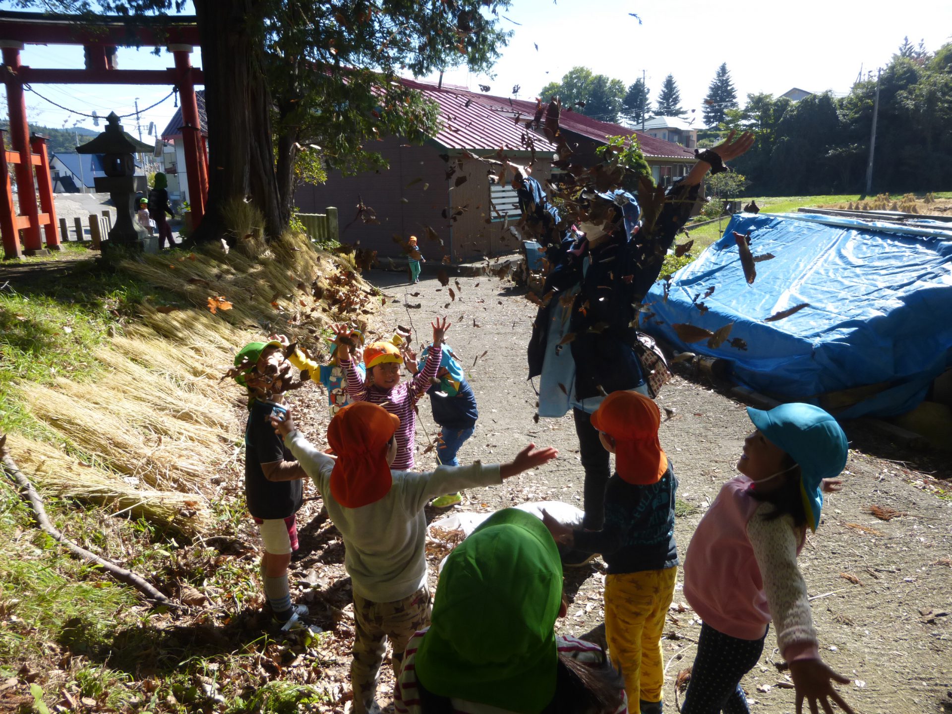 そして、その集めた落ち葉は葉っぱのシャワーになり、「うわー!!」と子ども達から歓声があがりました。とっても気持ち良さそうですね!!