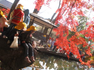 石に座って眺めていると、「池の中にももみじがあるよ~(^^♪」水面にも映ってとってもきれい!