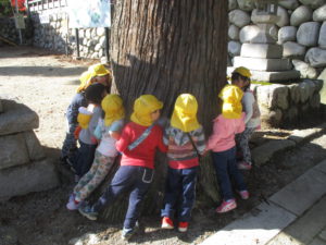 「この木でっかいね~!」一人じゃ手が届かない!」「みんなでやってみるか!」