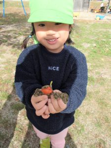 一歩、園庭に出ると、面白いこと・楽しいことを見つけることができる一人ひとりの遊びへの意欲を大切にしていきたいと思います。