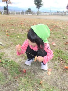 西穂高認定こども園では、毎年この時期になると園庭にある樹木からたくさんの種類の葉っぱや木の実が落ちています。