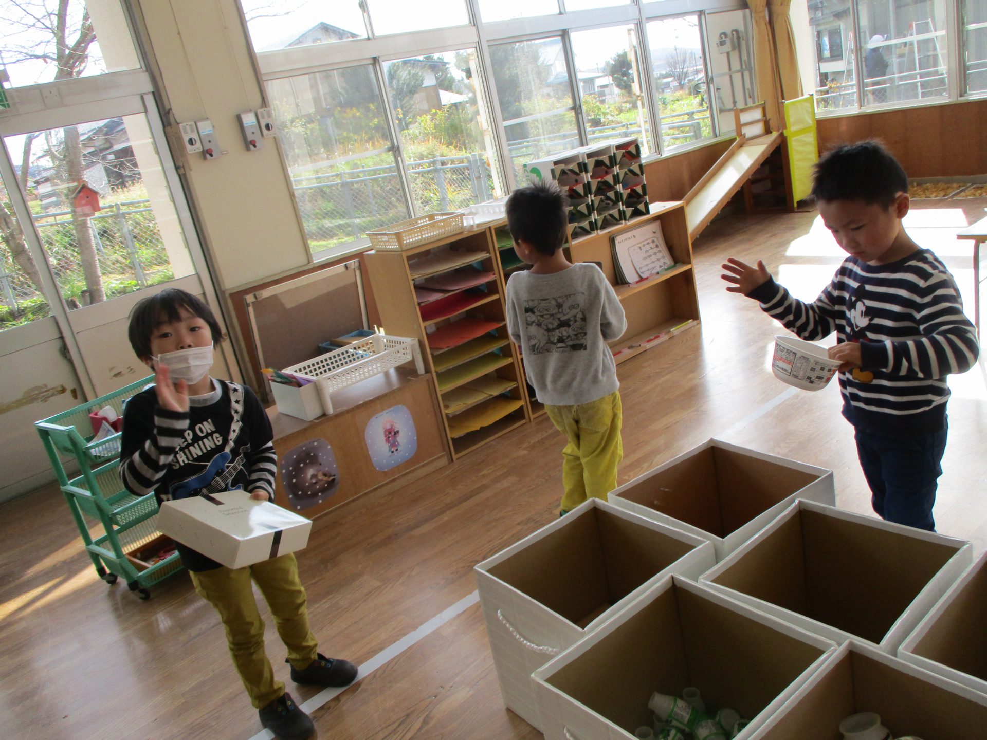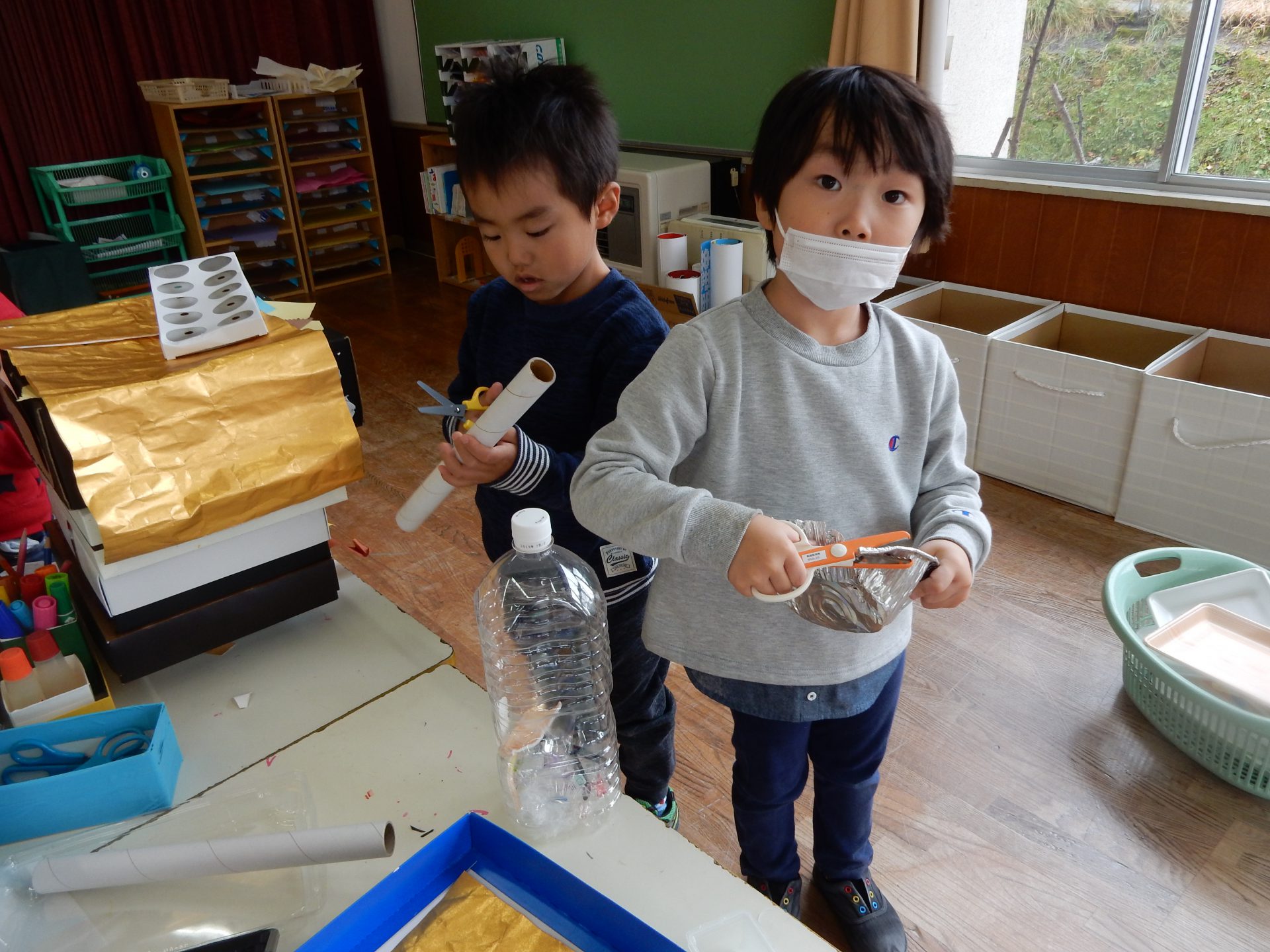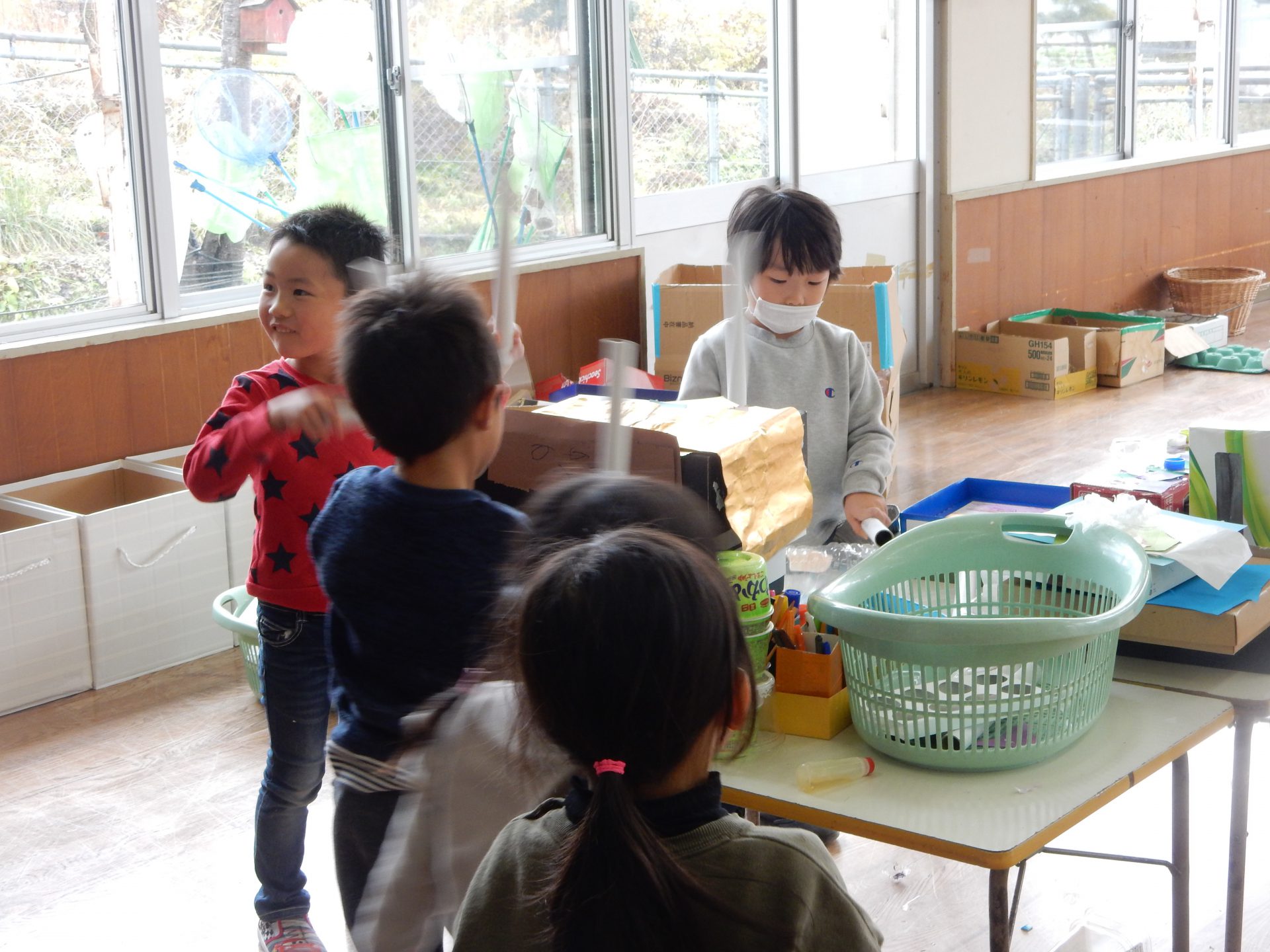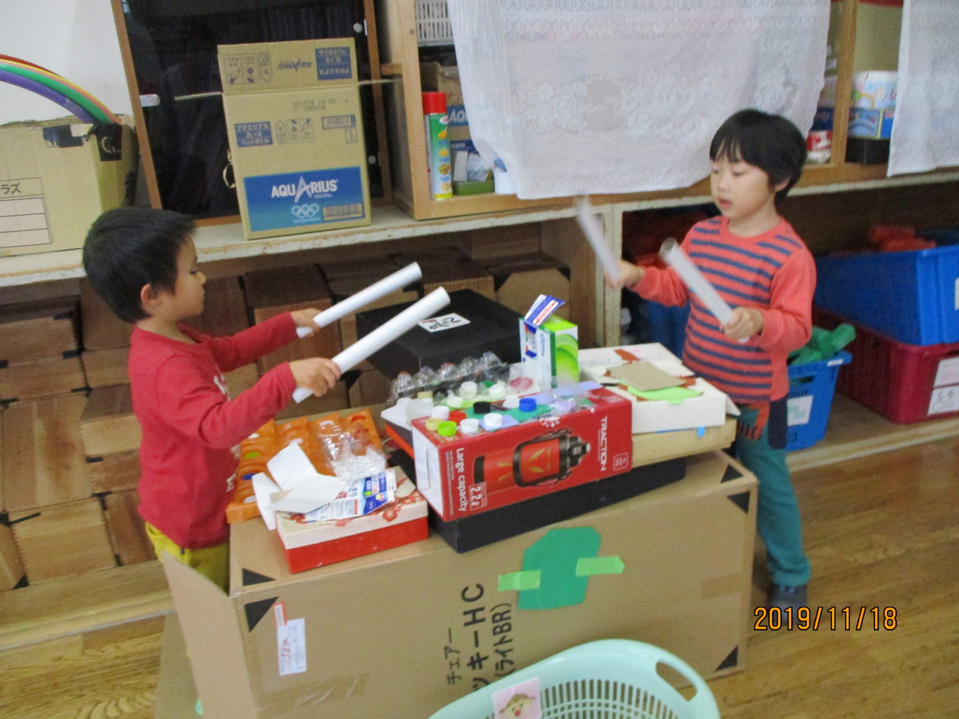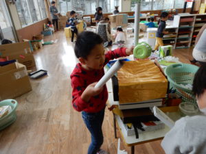地区のお祭りで見たお神輿に太鼓がついていたから作りたい!とやる気満々の太鼓グループさん。ラップの芯をバチに見立ていろいろな箱をたたきながら音を確かめていました。どんな太鼓ができているのか見てみると、空き箱にペットボトルのキャップがくっついていたり、卵パックの中にキャップを入れてあったりして、叩いてみるとそれぞれ音が違うんです。中に何かが入っているところ、何も入っていないところでも音に違いがあり、「ここを叩くとこんな音がするよ!」「ここはこんな音だよ!」と発見したことを嬉しそうに教えてくれます。
