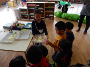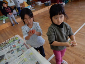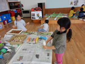 紙粘土や絵の具を使って作っていると、周りの友達も気になり、「やってみたい」と近寄ってきます。「やってもいいよ!こうやるんだよ!」と友達にやり方を教えてあげたり、分けてあげたりして枠にとらわれず受け入れてあげる姿に優しさを感じました。