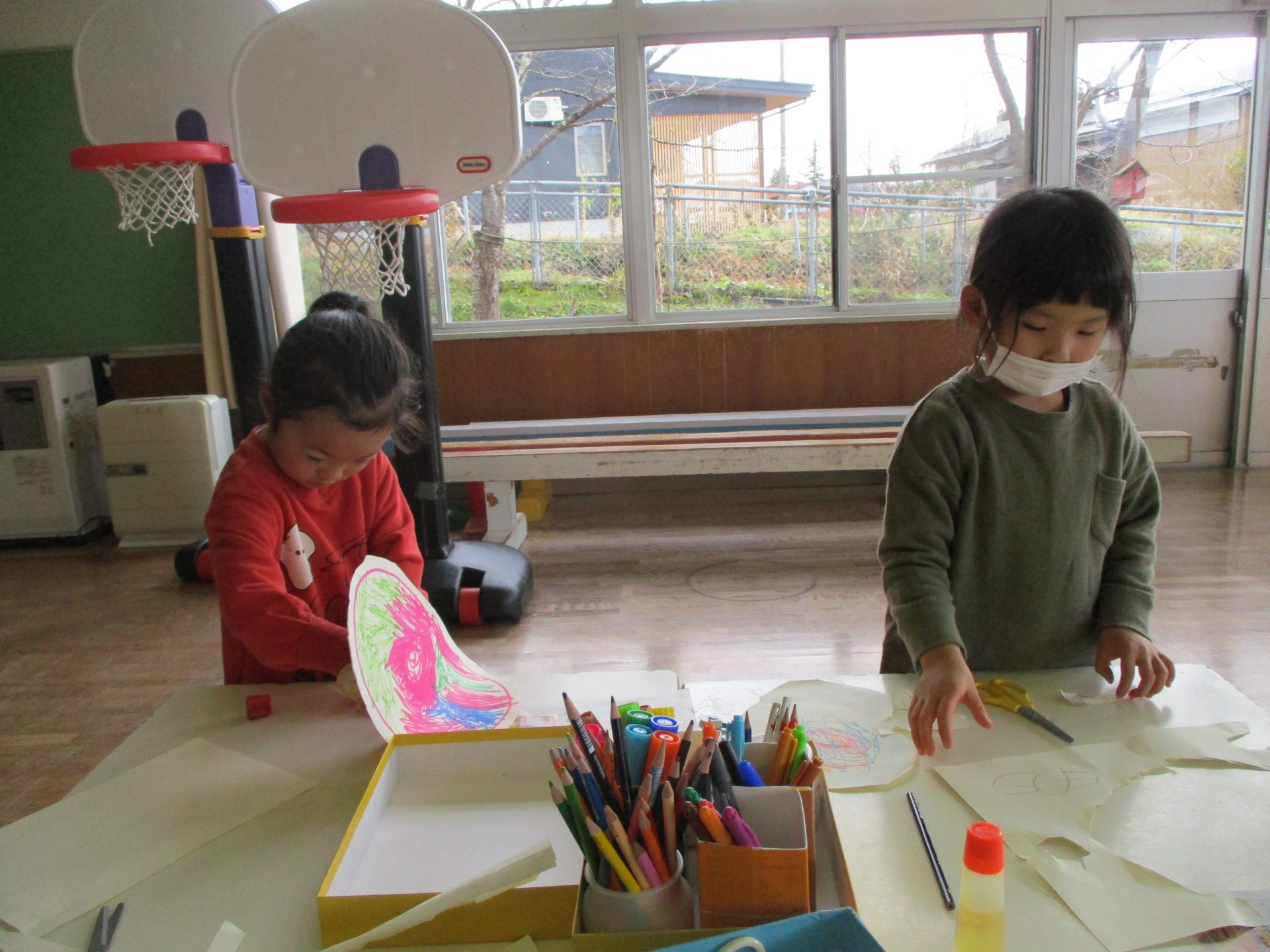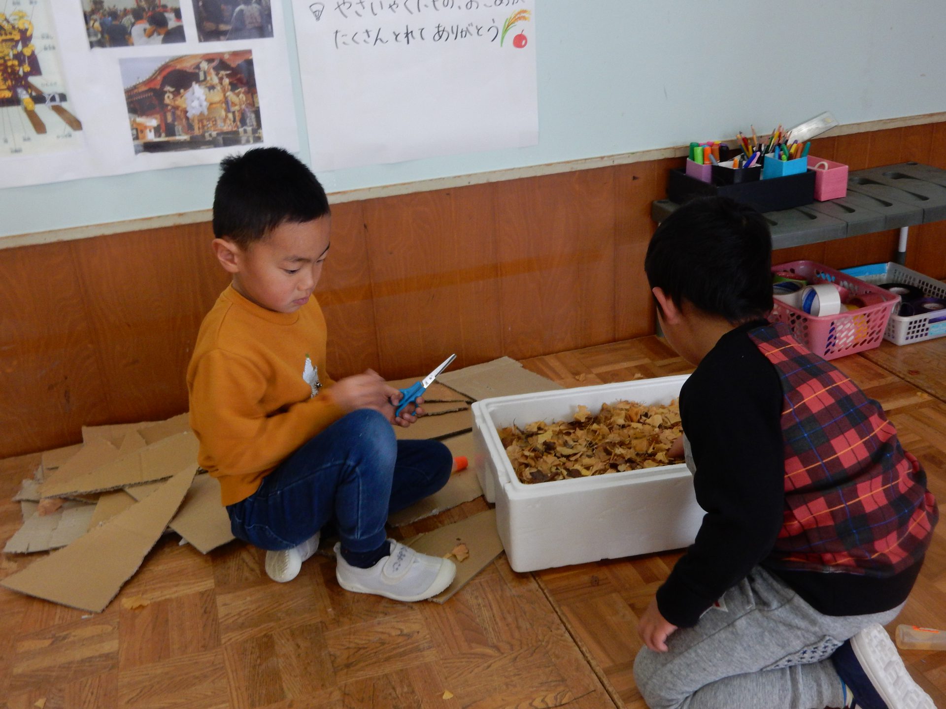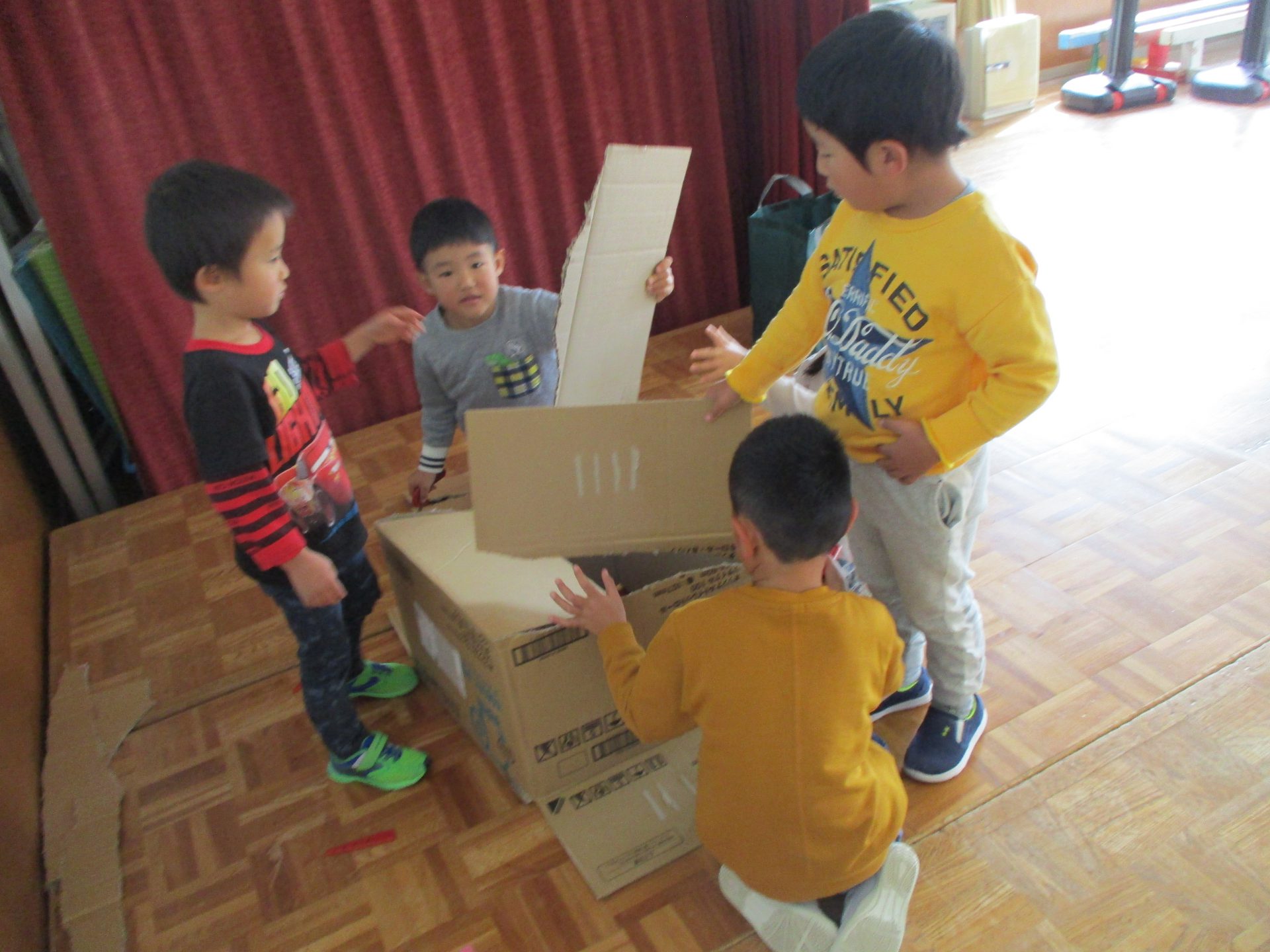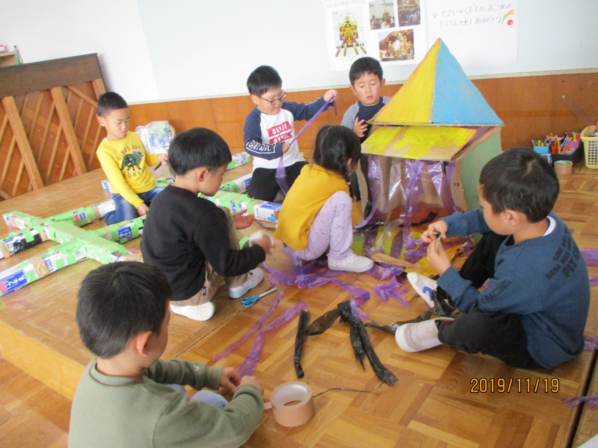 ダンボール箱を切って必要なところはガムテープで貼りお神輿作りが始まりました。はじめは少し保育士も手伝いながら大まかな形が出来てくると、「色つけたいね!」「中にはお獅子を入れようよ!」「お獅子が見えないようにシャラシャラのカーテンをつけよう!」と、子ども達はイメージが沸き、思ったことを言葉で伝え、「○○はどう?」「それいいね!やってみようよ!」と友達と相談する姿が見られるようになりました。