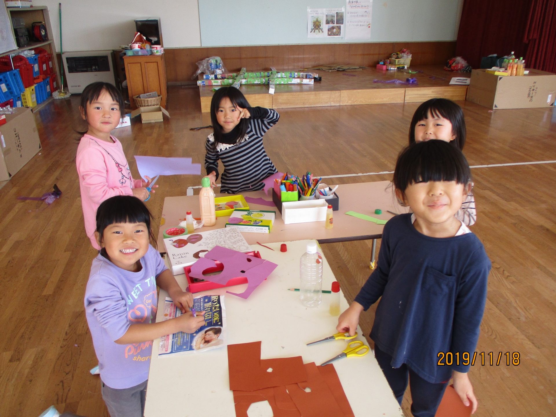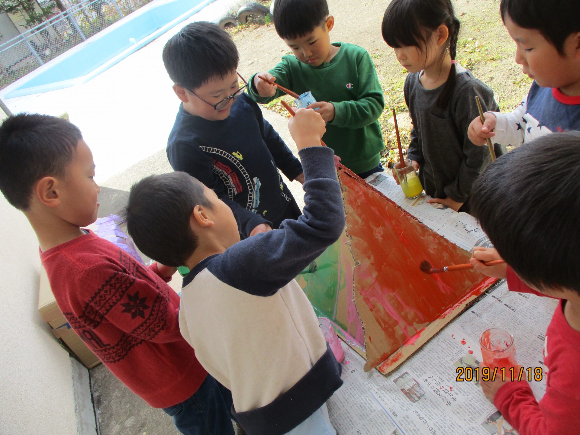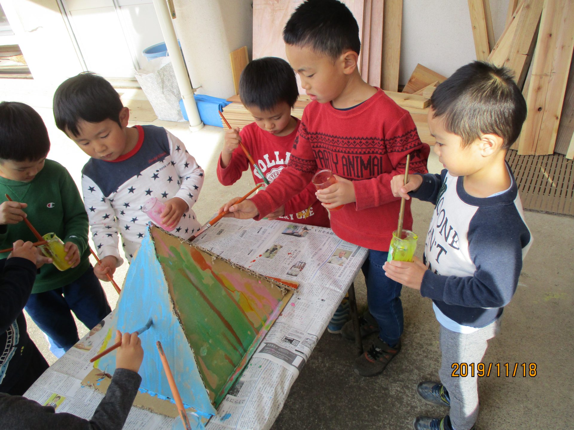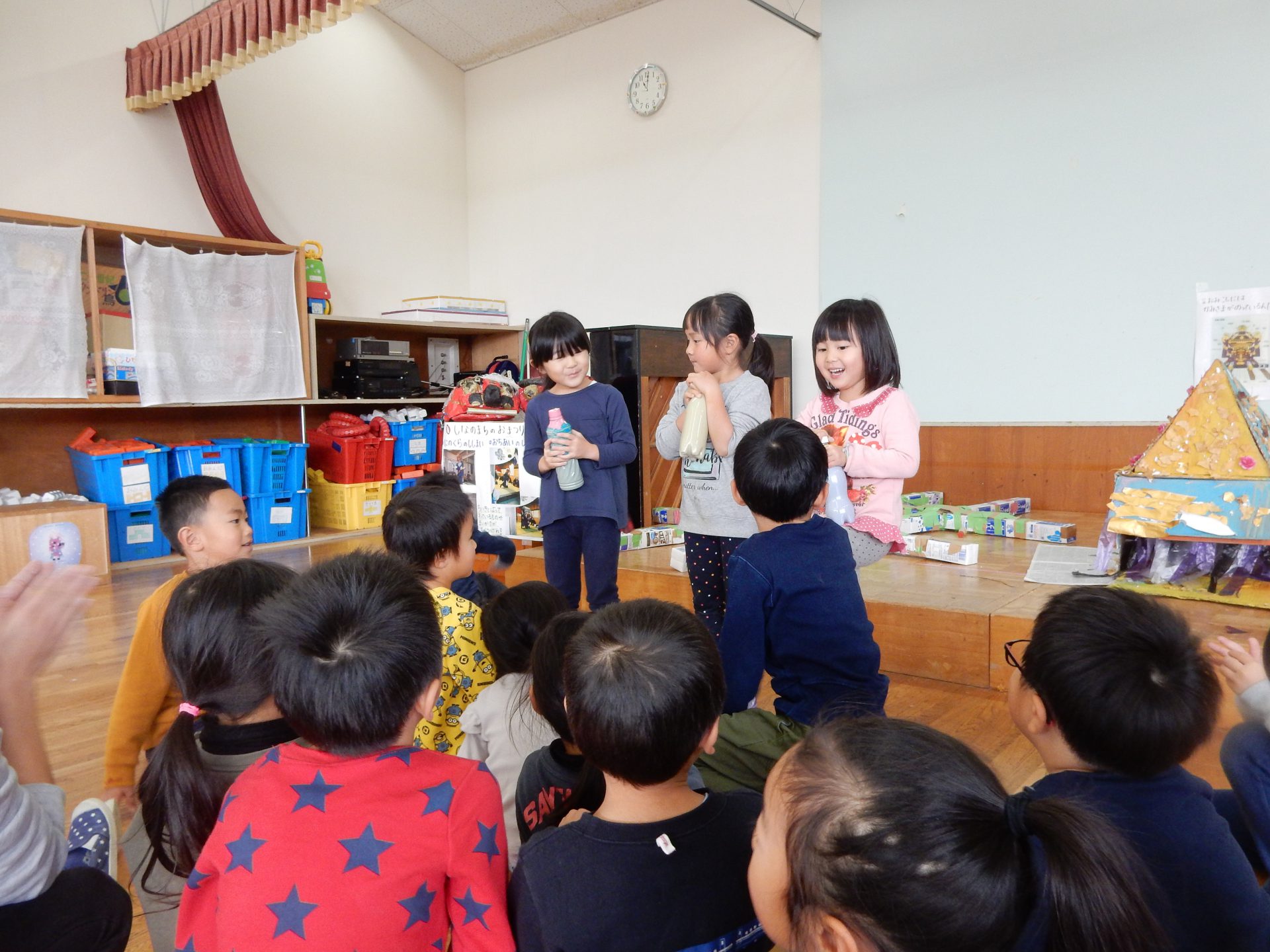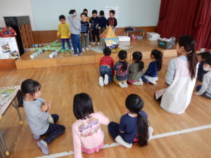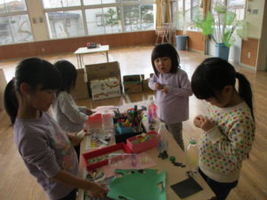 グループに分かれると、他のグループは何を作ったのか、どこまで進んだのかなど分からないので、最後に少しだけ友達同士で見せ合う時間を設けることにしました。はじめは保育士が前に立ち話をしていたのですが、「発表したい!」と子ども達から前に立ち、今日やったことを話してくれます。中には「ボンドがまだ乾いていないので触らないでください!」と注意を促す子もいました。
