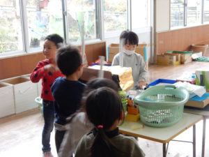 「お店もあったらいいよね。」と女の子のつぶやきでお店屋さんもやることに。「かき氷やさんは?」「もう寒いよ!」「ジュース屋さんは?」「タピオカジュース作りたい!」と女の子を中心に話が盛り上がっていました。それぞれ作りたい物が一緒の友達同士でグループに分かれ、どういう風に作るのかは子ども達に伝えず、自然と作りだす姿を見守っていました。