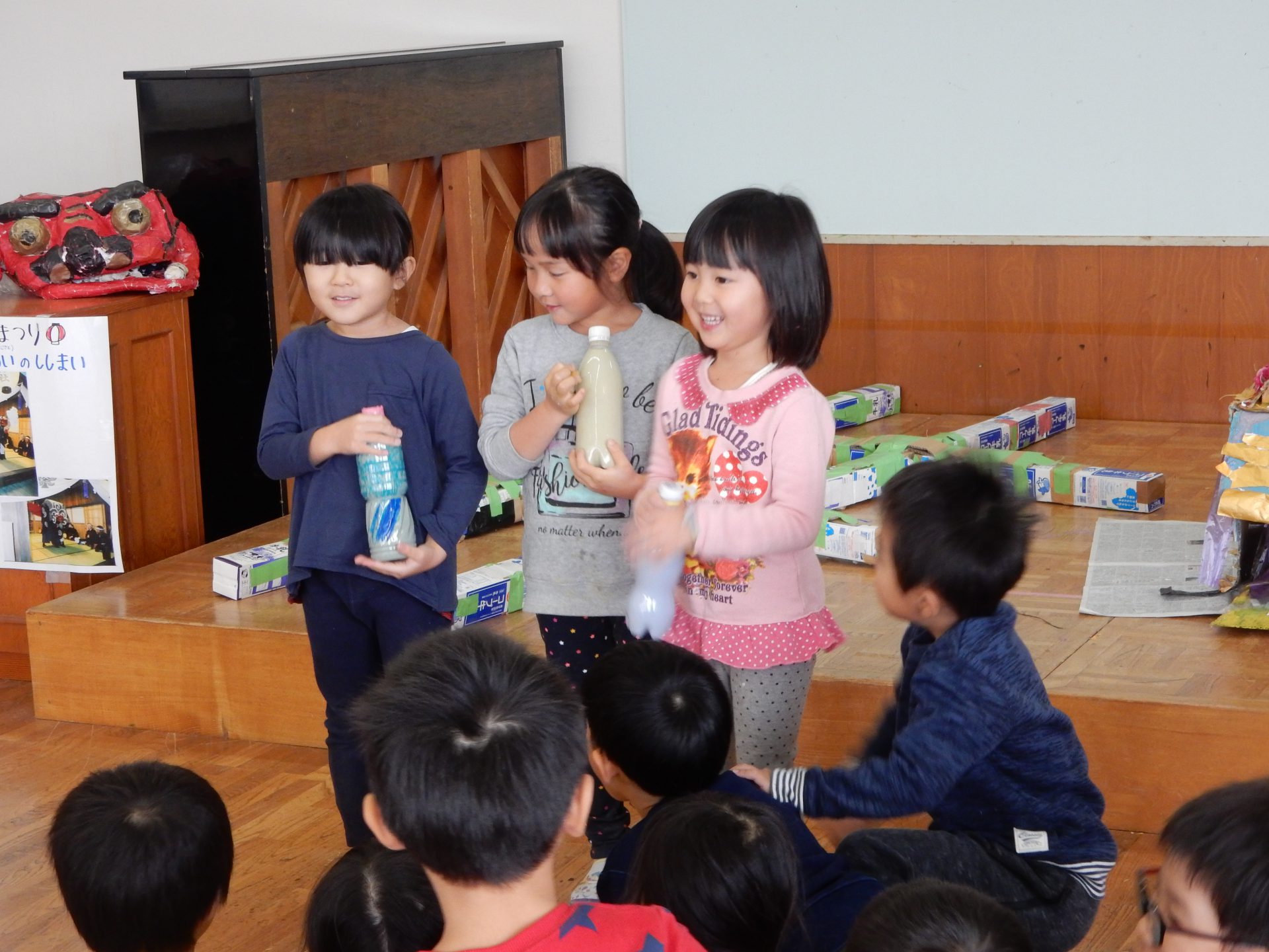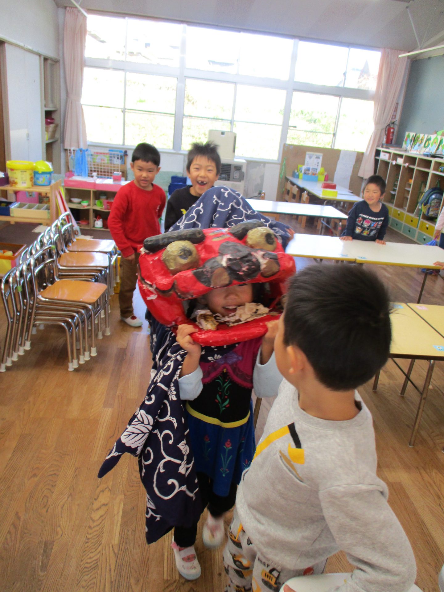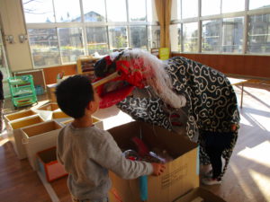 ふと思い出したようにある男の子が聞いてきて、クラスの中でお獅子はどうする問題が浮上しました。「これから作る?」「まだお神輿も出来てないし間に合わないよ・・・」困っている子ども達を見て町内の他の保育園からお借りしました。(古間保育園さんありがとうございます。)他の園から借りてきたということもあり、「これは借りているから大事にするんだよ!」「やさしく使おう!」と子ども達の物を大切に扱う意識も高まっていました。どうやって舞うのか実際やってみるとなかなか難しい。「こうかな?」「○○くん上手!」と友達同士で見合いながら楽しんでいました。