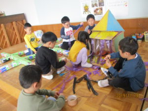 はじめた頃は自分一人で作り進めてしまったり意見がぶつかることとがあったりいろんなことがありましたが、遊びが深まるにつれて友達の思いをくんだり伝え方を工夫したり、子ども達の姿にも変化してきています。