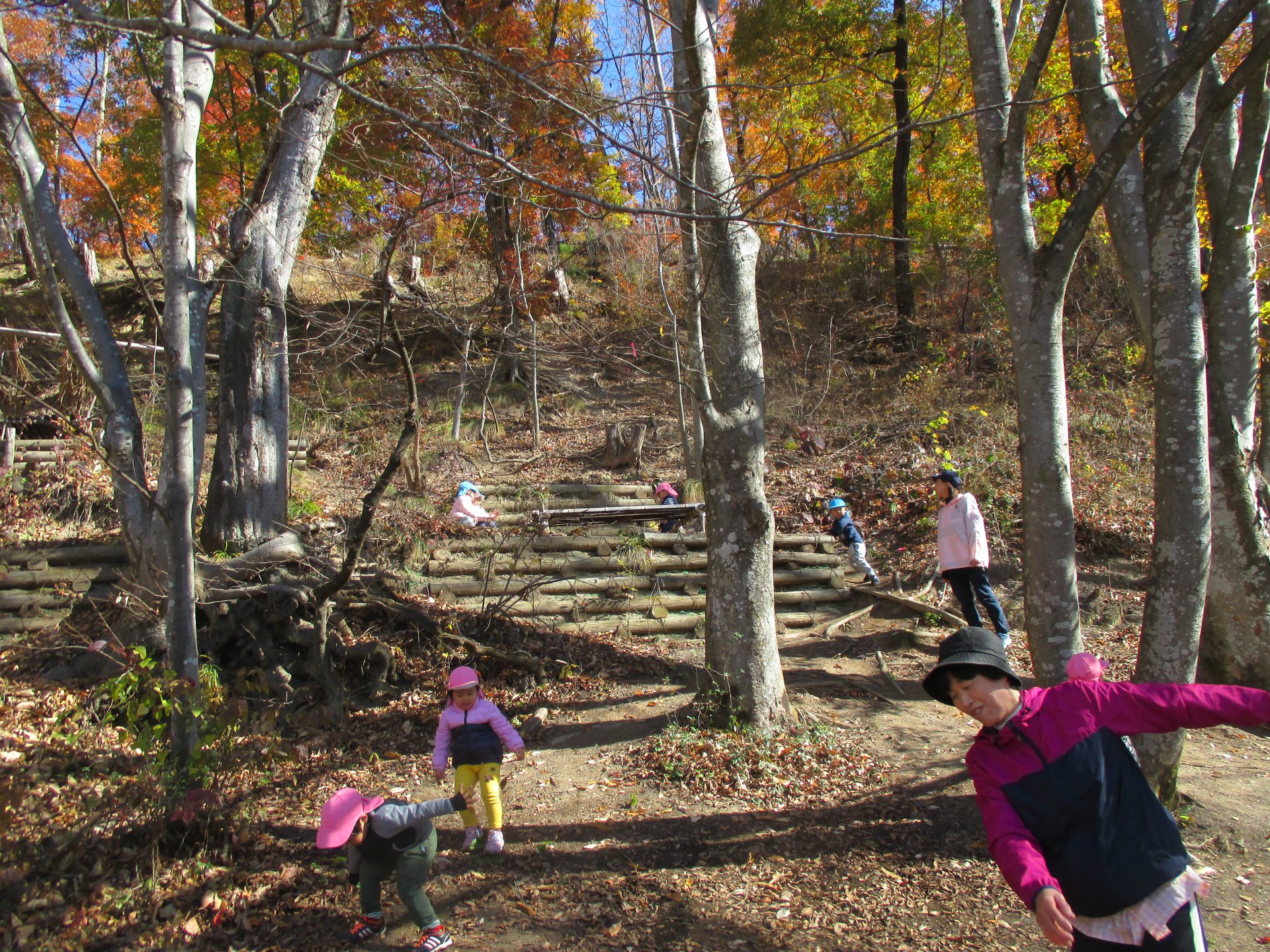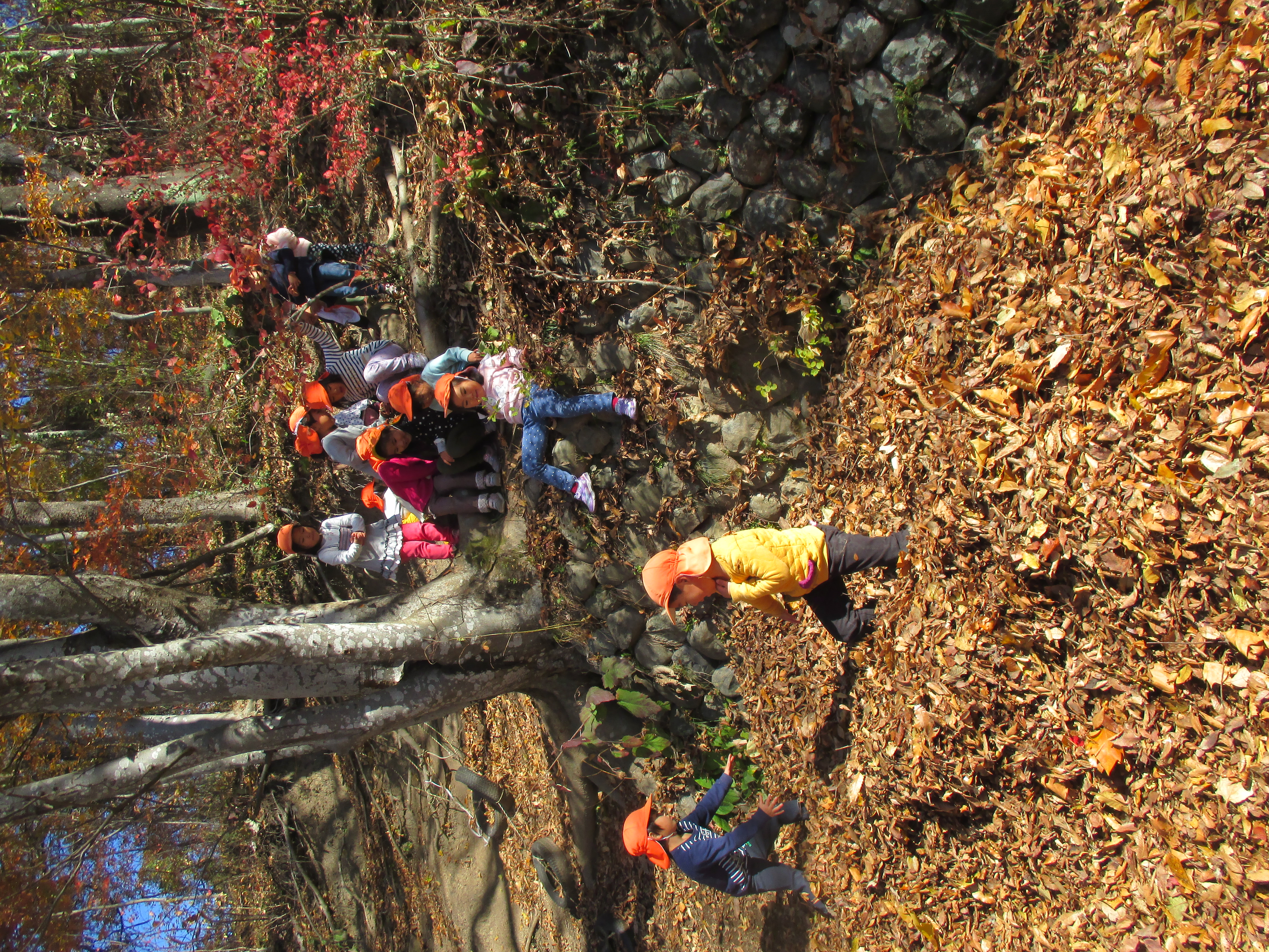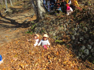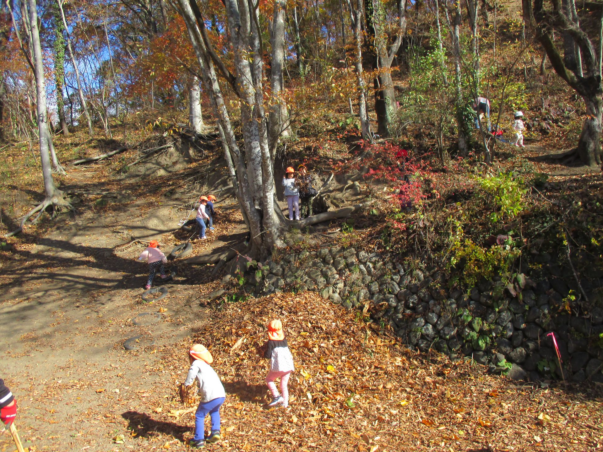 2歳児も大きい組さんに刺激を受け山登りや落葉遊びを楽しんでいます。一人で高い所まで登れるようになりました。