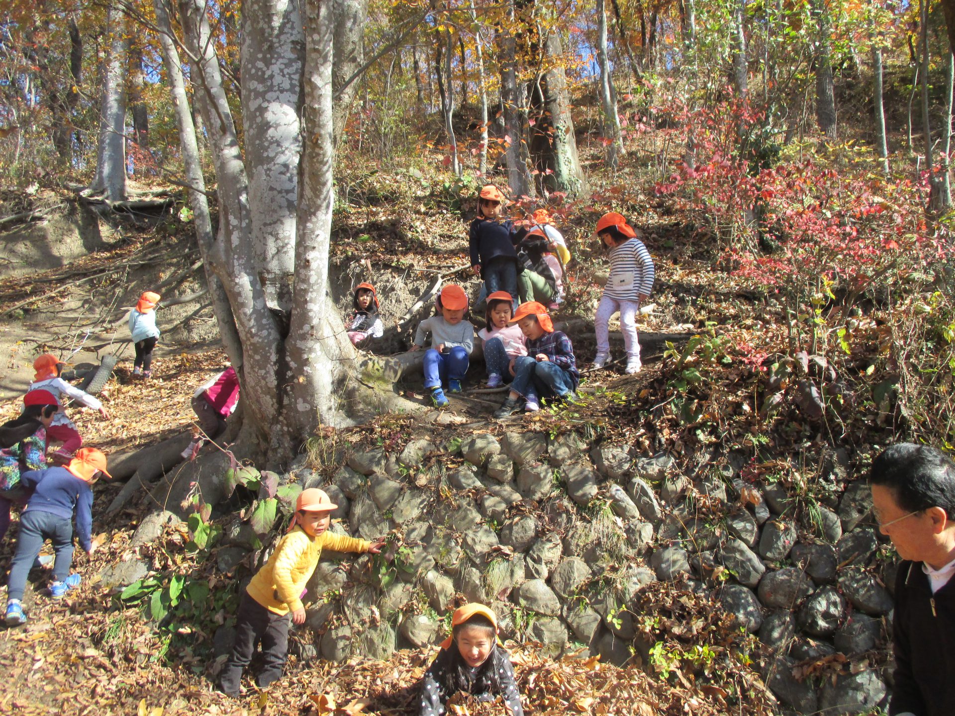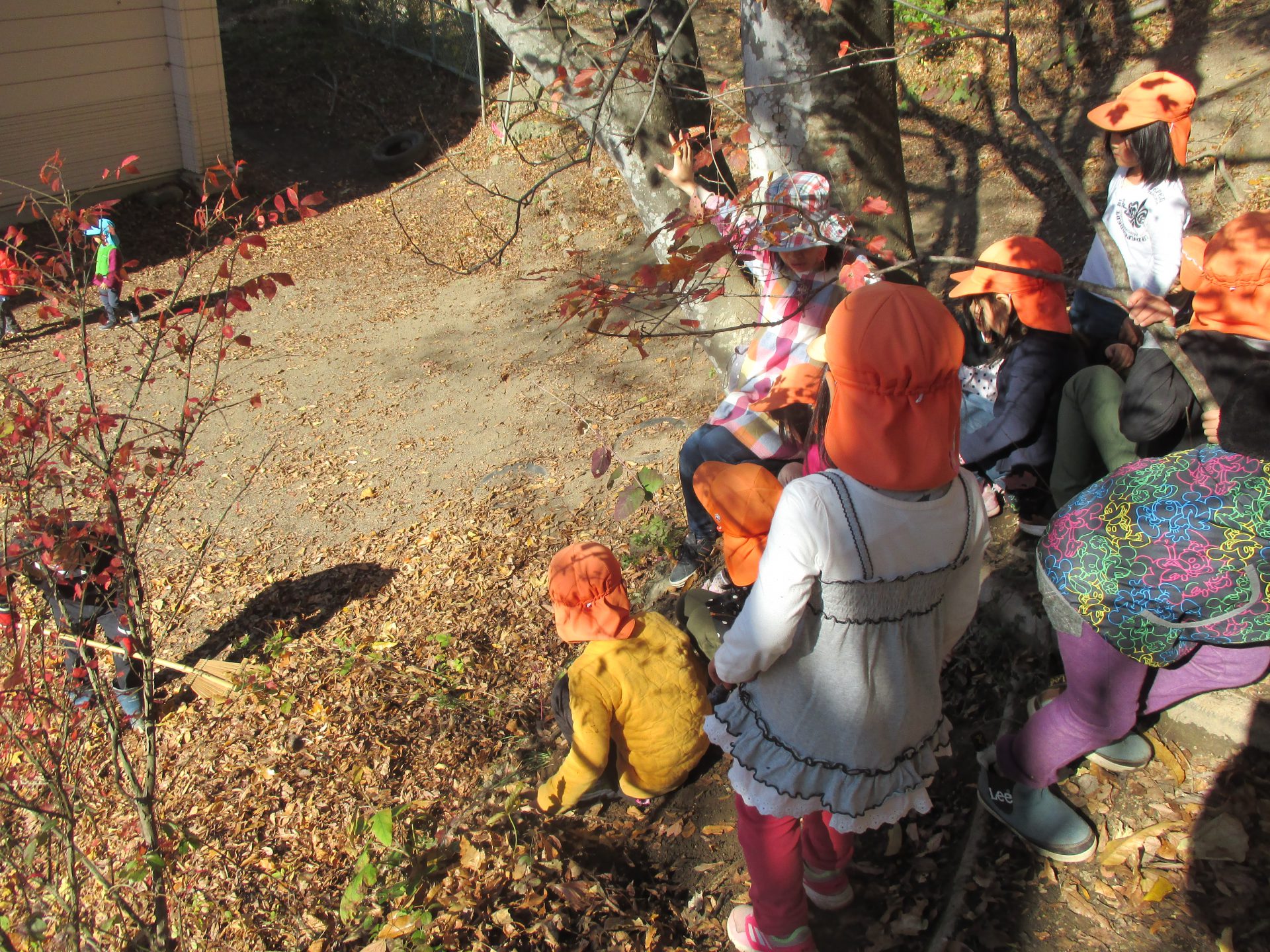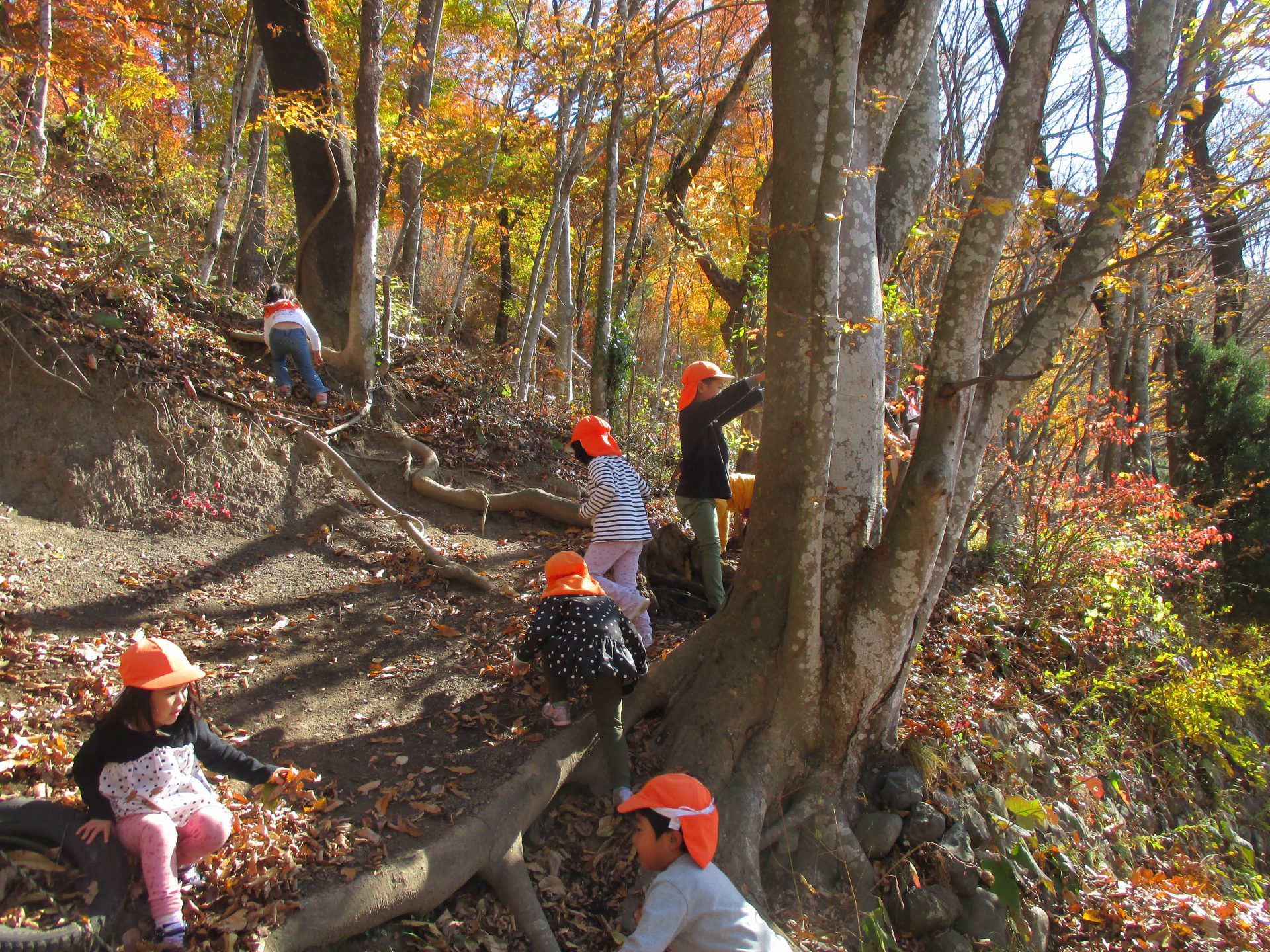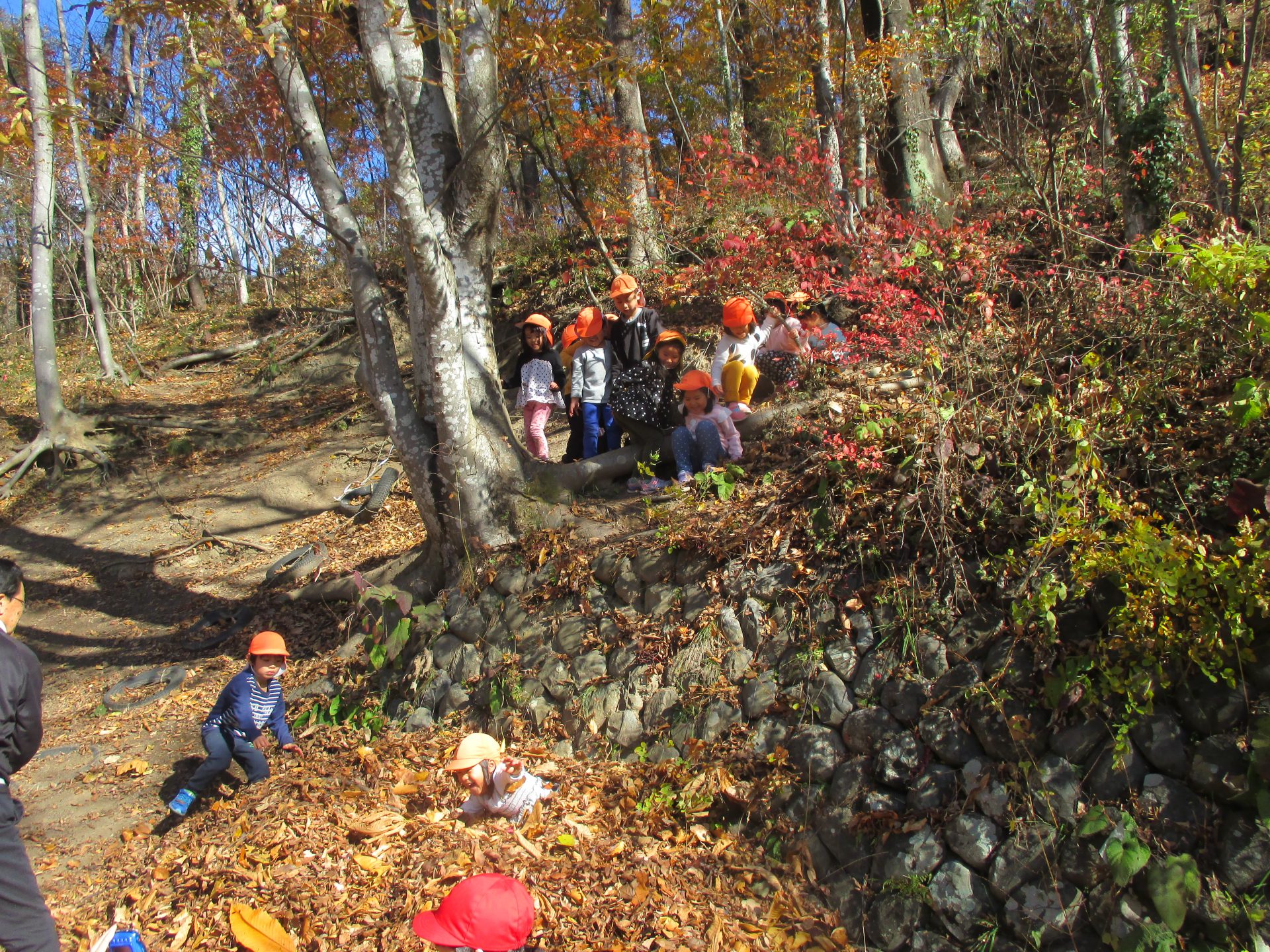 2歳児も大きい組さんに刺激を受け山登りや落葉遊びを楽しんでいます。一人で高い所まで登れるようになりました。