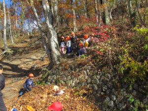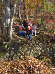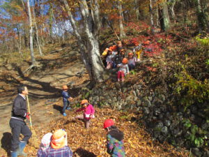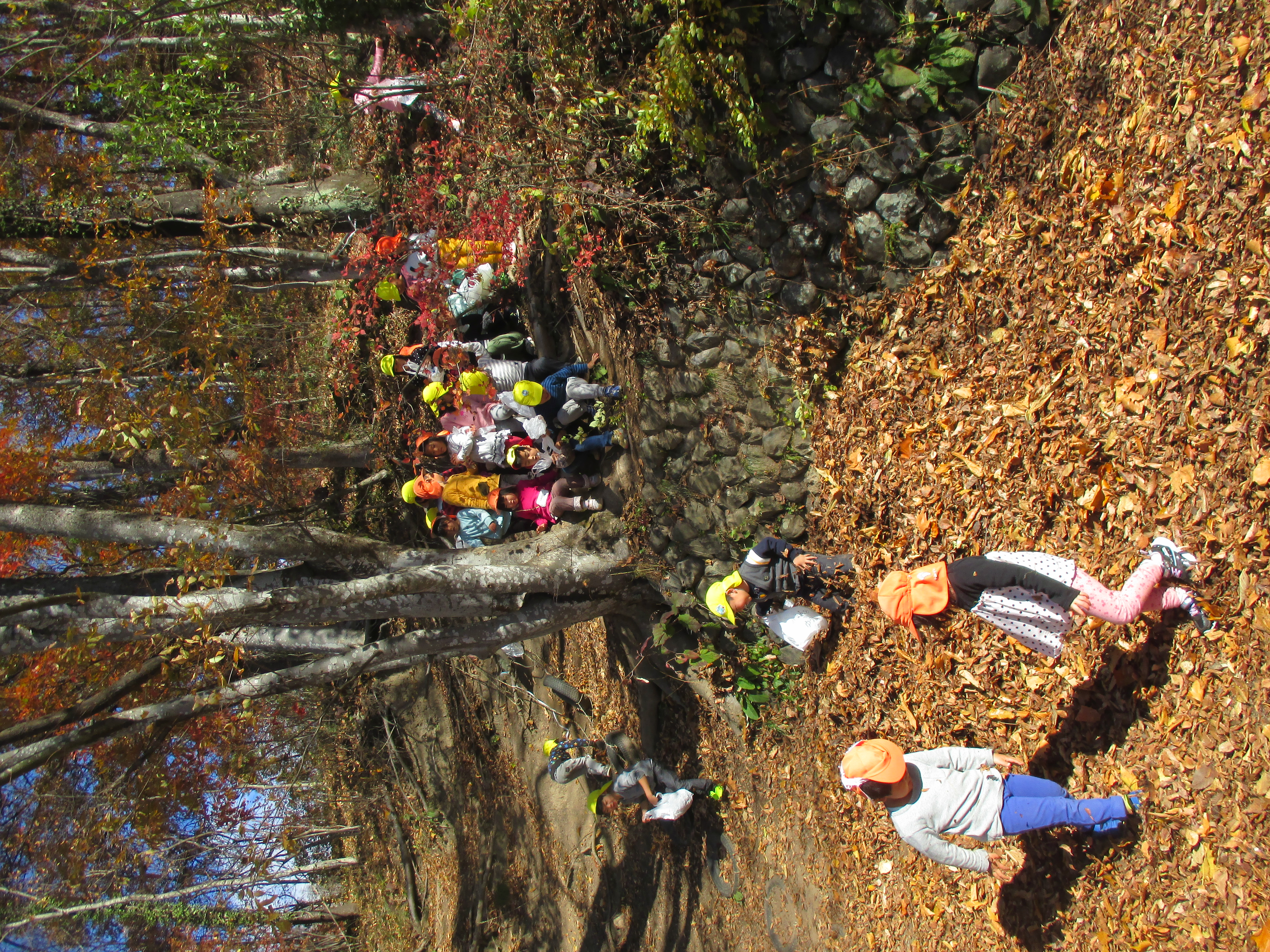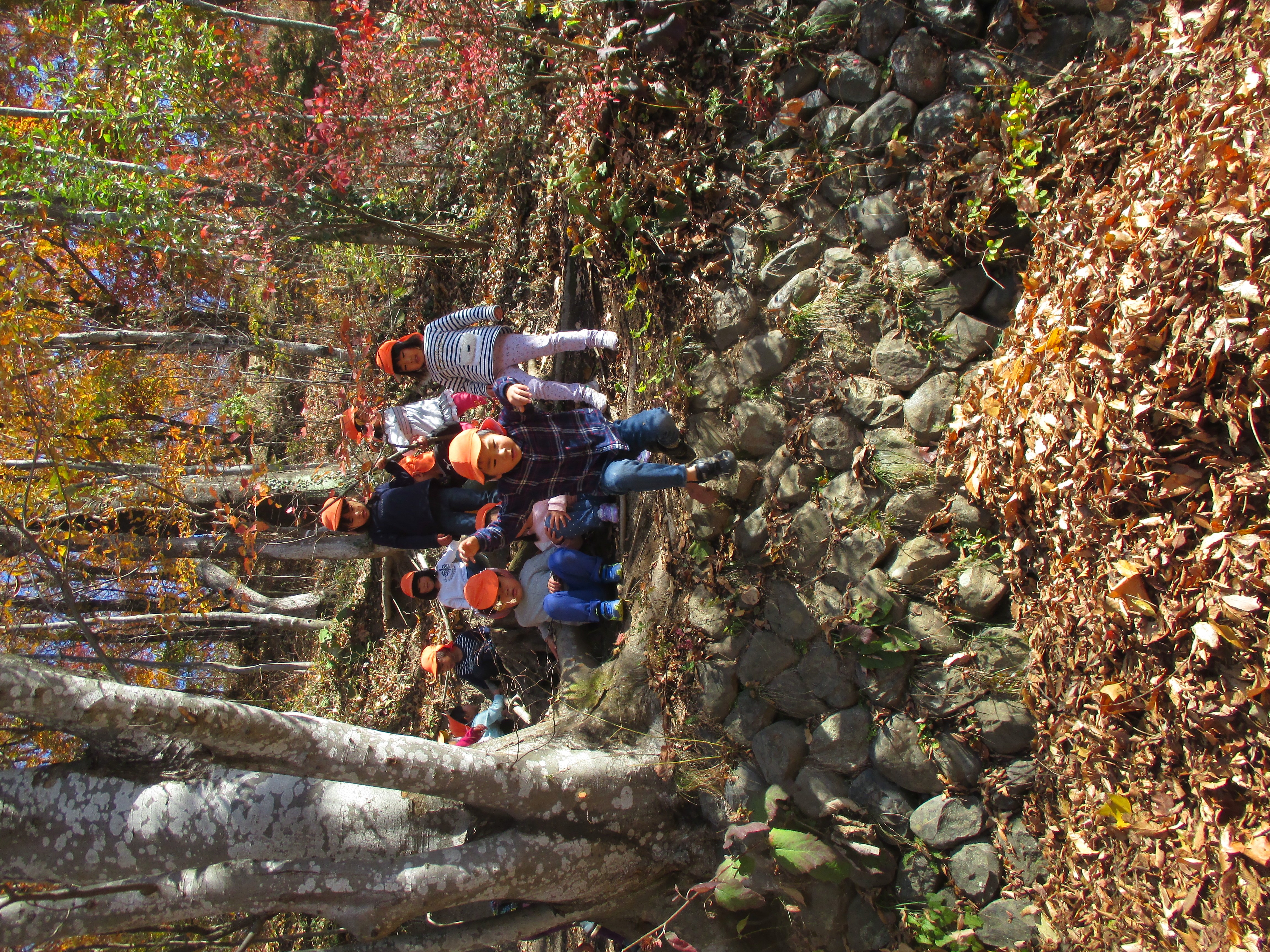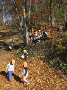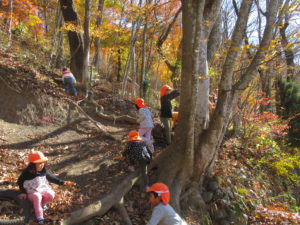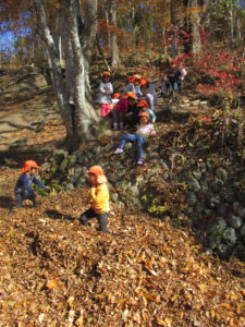 子ども達の大好きな裏山!!自然が友だちの子ども達。保育士の目が行き届く場所までは、みんなが登れます。足腰が強くなりました。「先生疲れた。」と言う子どもは居ません。強い心と体が山遊びを通して育っています。
