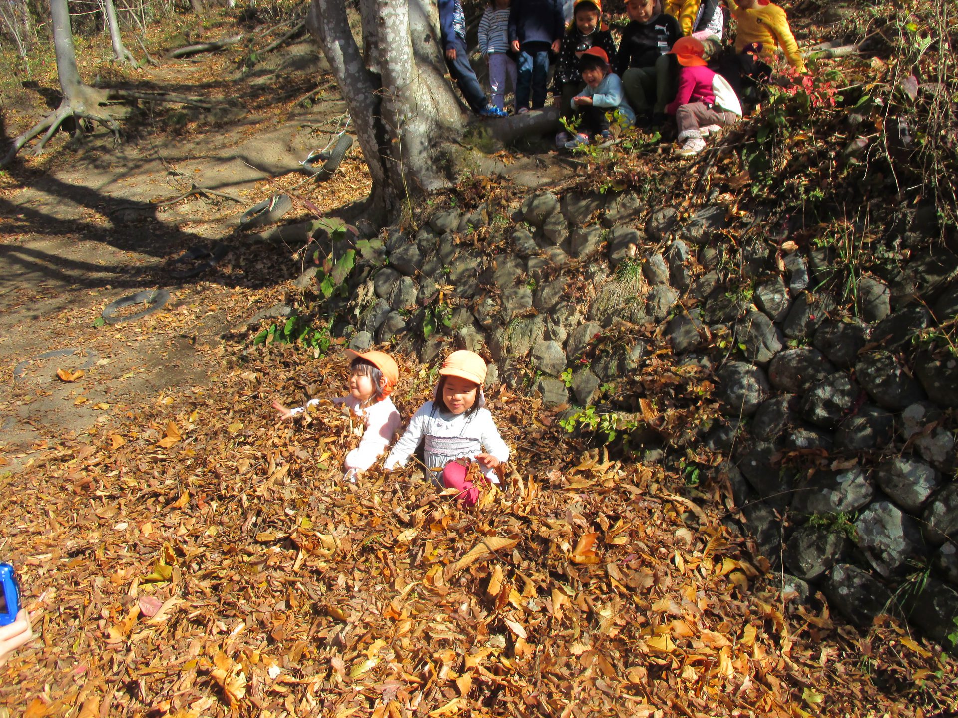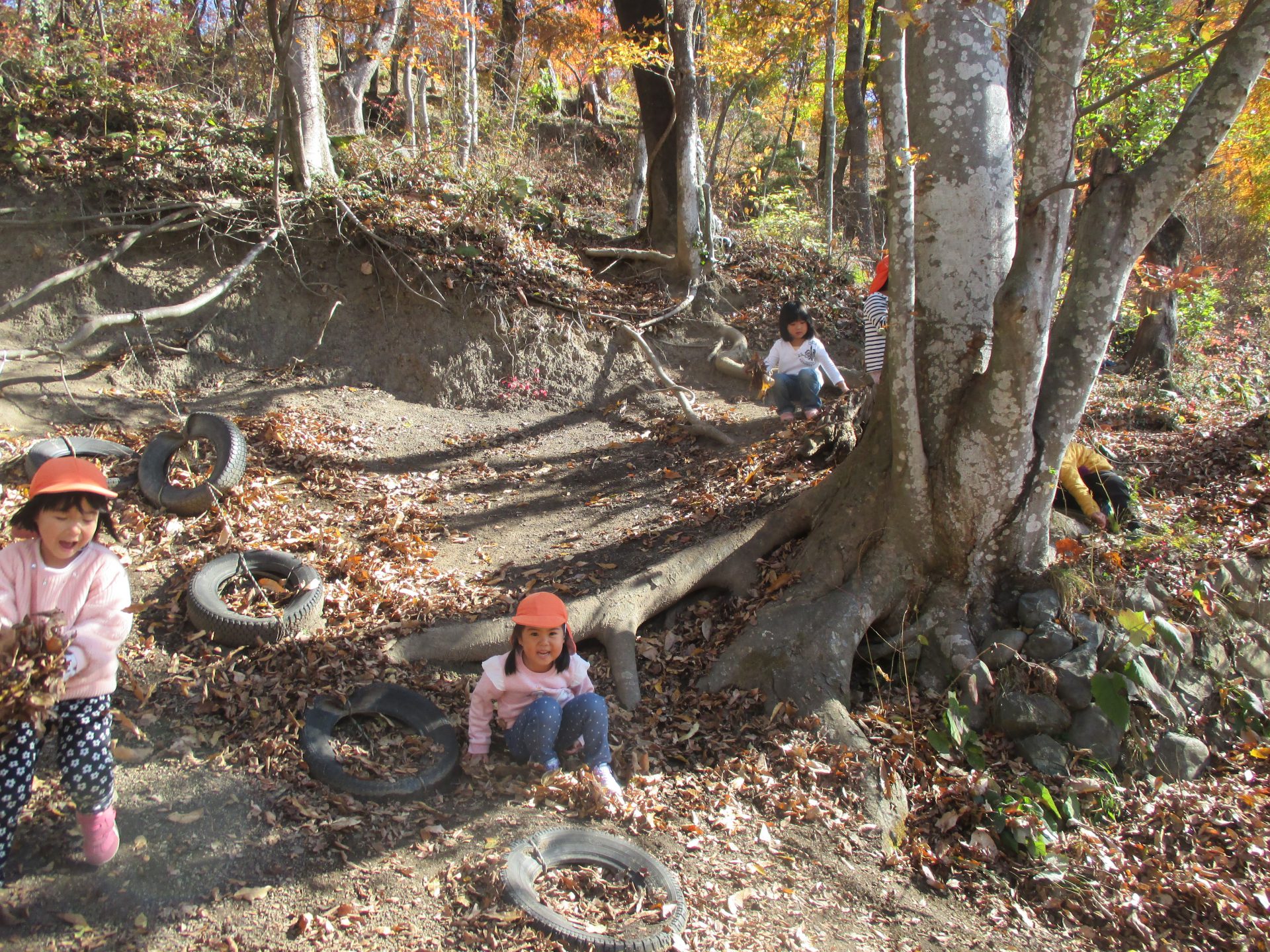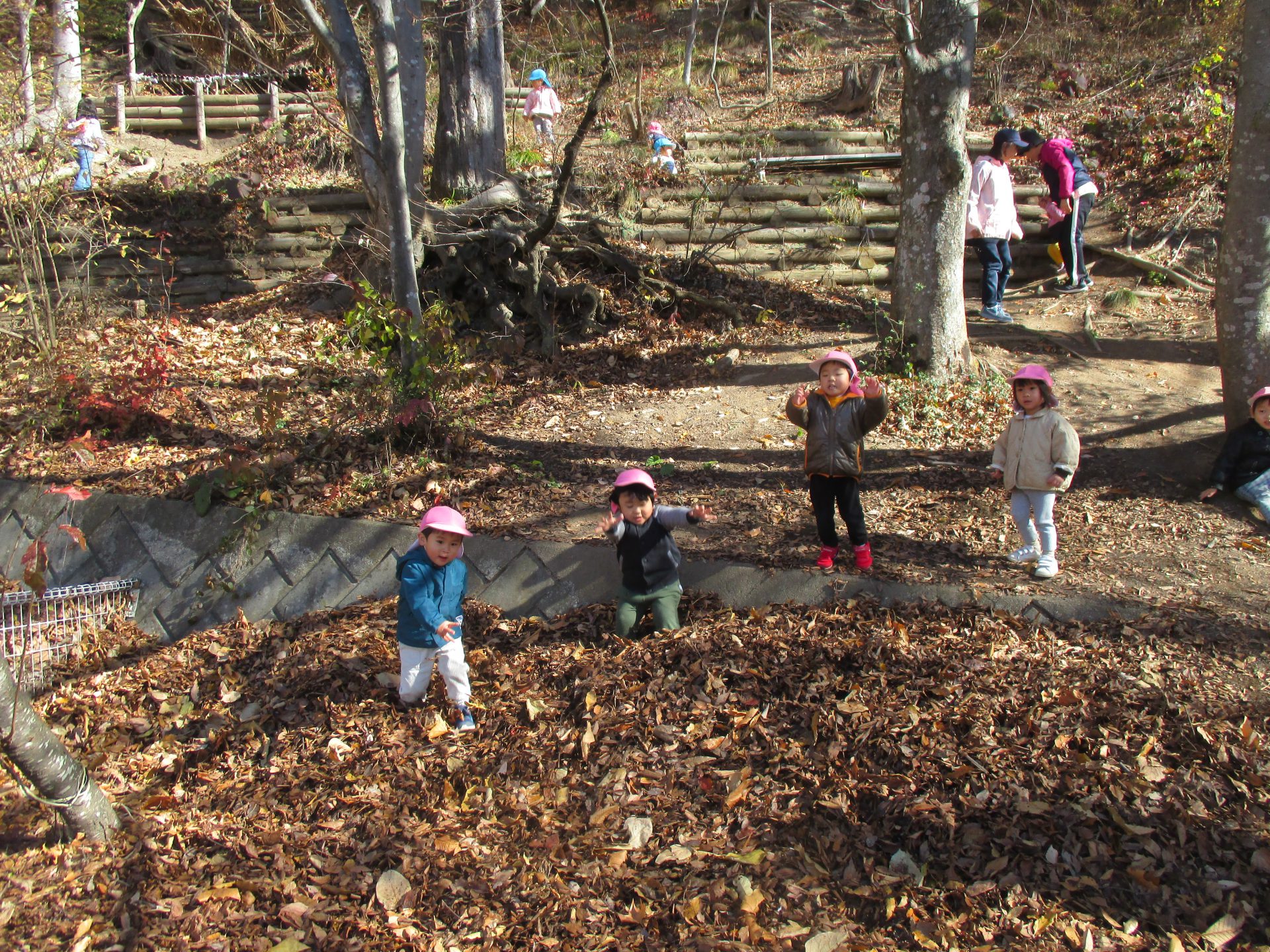 山の近くの園庭には、自然に積まれた落葉。この環境の中大胆な落葉遊びができ、昨年の経験からジャンプ遊びが始まります。子ども達が主体的に動き楽しんでいます。保育士は危険ないよう見守っています。