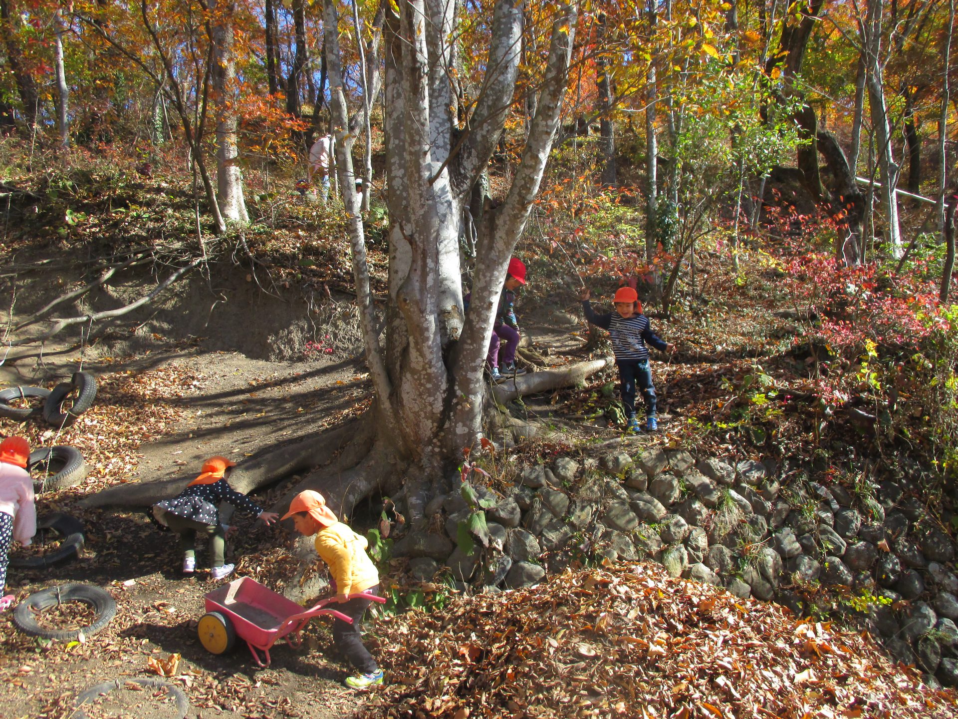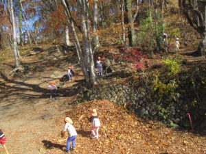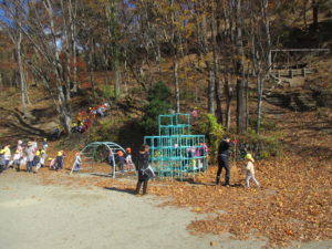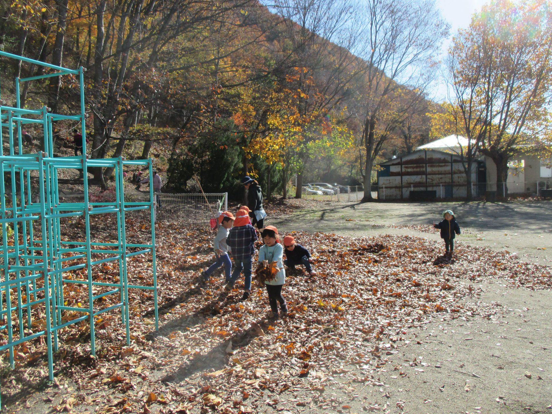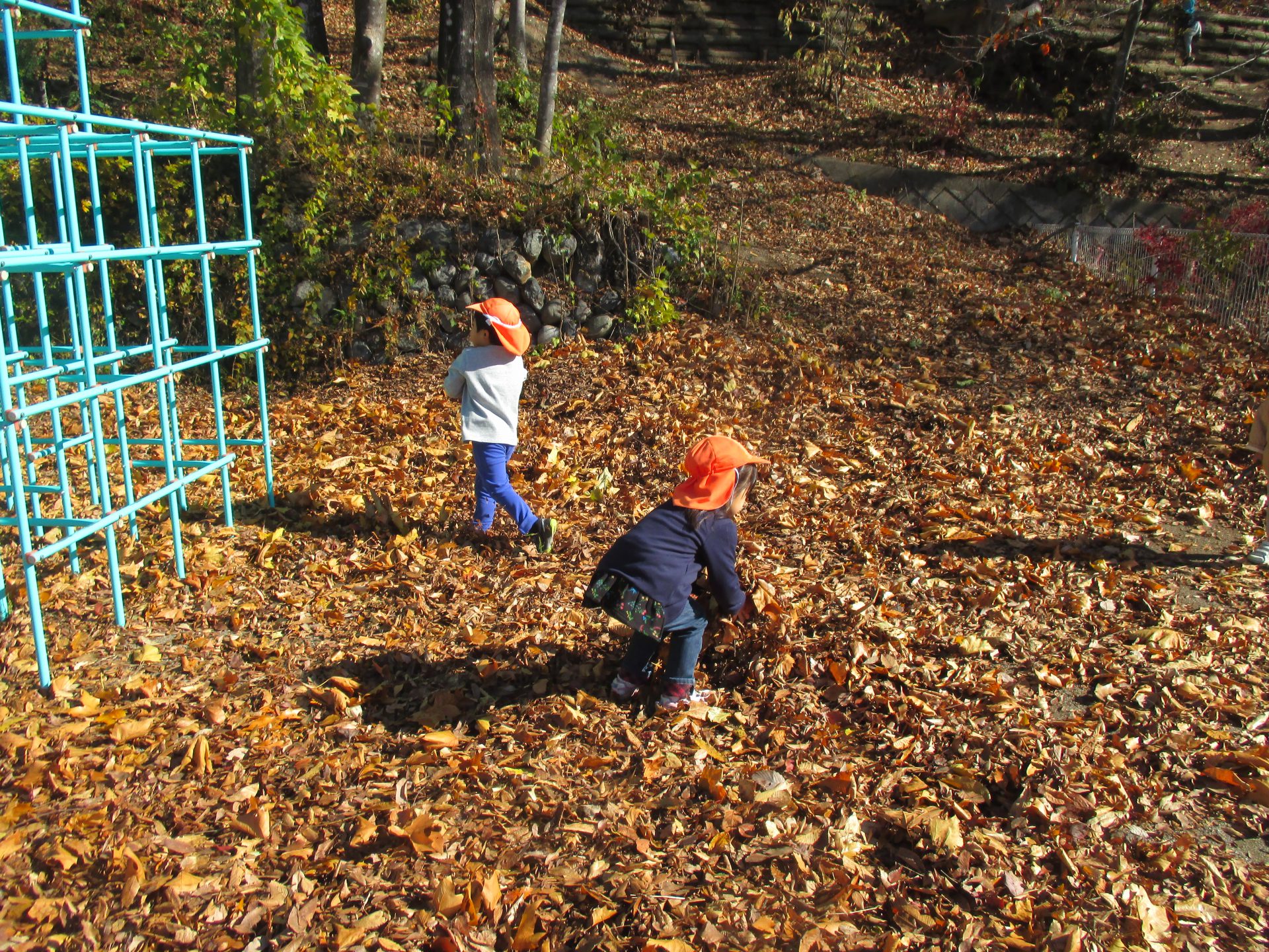 山の近くの園庭には、自然に積まれた落葉。この環境の中大胆な落葉遊びができ、昨年の経験からジャンプ遊びが始まります。子ども達が主体的に動き楽しんでいます。保育士は危険ないよう見守っています。