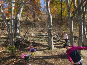 ・落葉遊びを楽しみ、落葉のジャンプ台で落葉の感触を味わう。