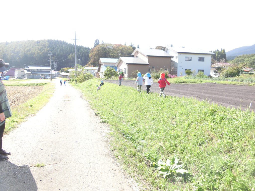 また、別の日の散歩です。田んぼのあぜ道が大好きな4歳児。探検に出掛けよう!いろいろな道を通ってみよう!の散歩が大好きです。安全が分かっているあぜ道を子ども達が先頭で進みます。