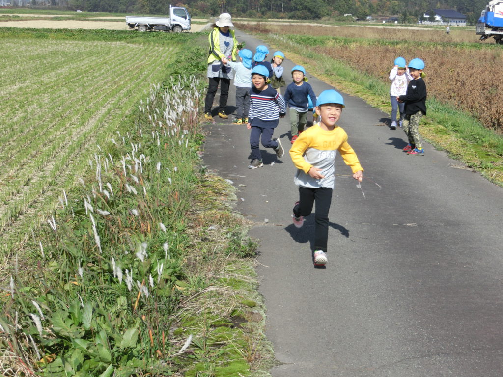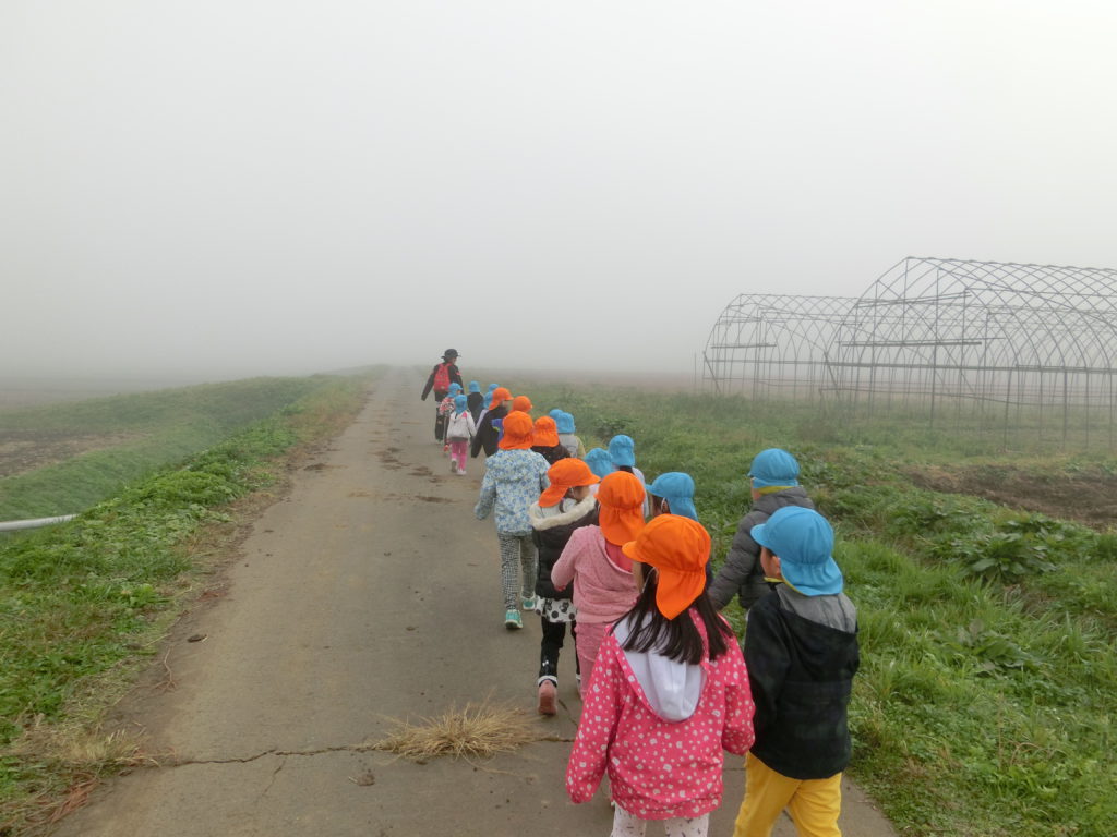 11月、秋晴れの中、散歩日和にはたくさんでかけることが出来ました。ある日の散歩です。4、5歳児で目的を持って長距離を歩こう!とふれあい広場へ出かけた日でした。見通しのよい田んぼ道が特徴の富士里保育園ですが、この日はすごい霧!一歩外に出ると真っ白!でも天気予報は晴れ、なによりちょっとおもしろそう!ということで出かけました。