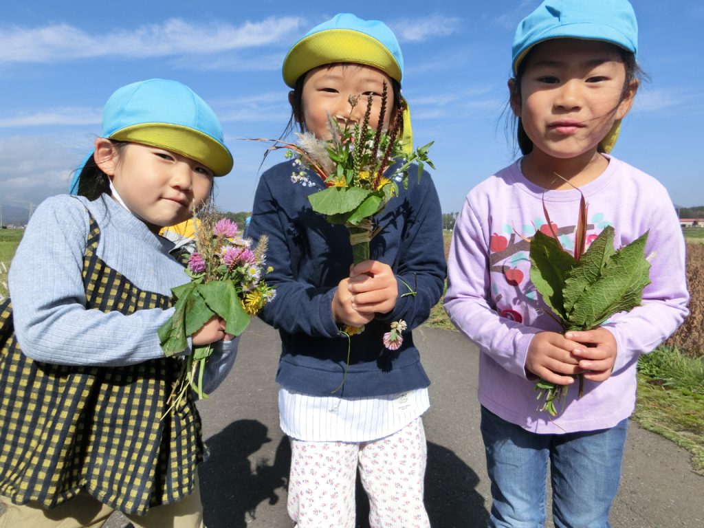 しっぽみたいな草を発見!「これでしっぽとりしよう!」「ほんとのしっぽがはえたみたい!」車のこない農道でしっぽとりゲームがはじまりました。「丸いしっぽだからうさぎだね。」「私はきつね!」いつものすずらんテープでは生まれなかった発想が出てきていました。