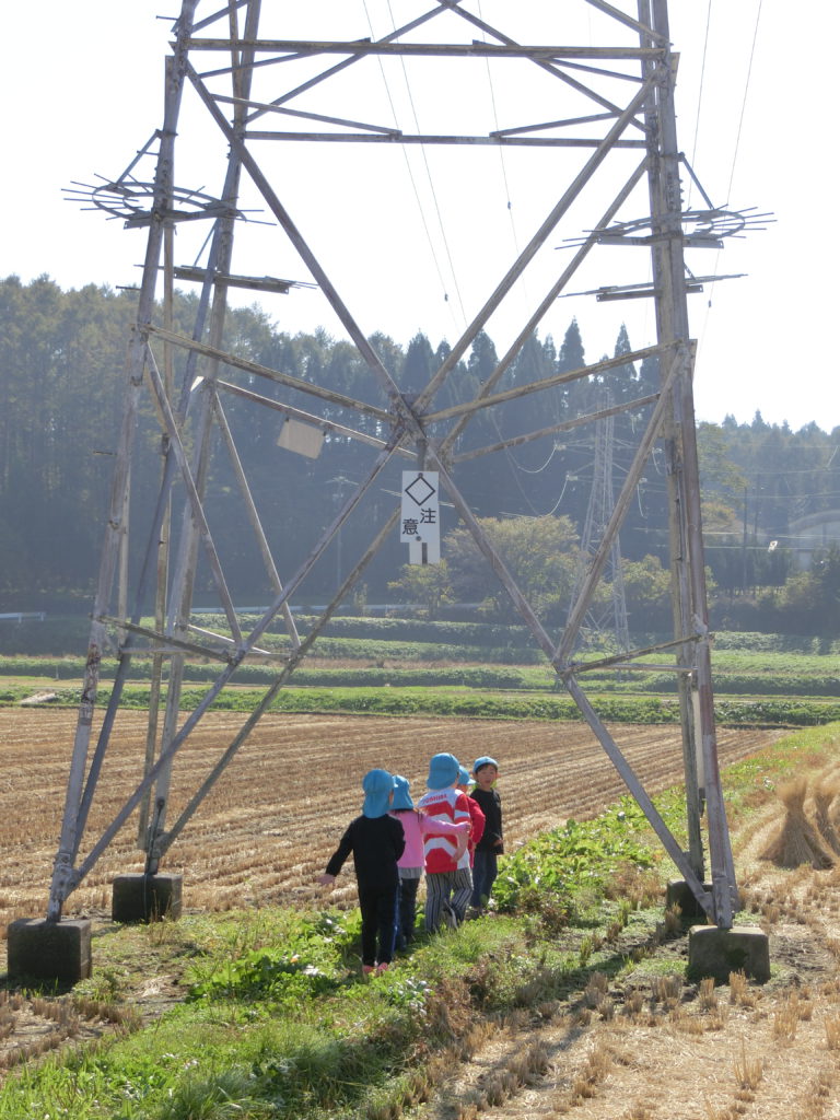 鉄塔の下のあぜ道を発見!「これはビリビリの道だね。」鉄塔=電気=ビリビリという連想かな。