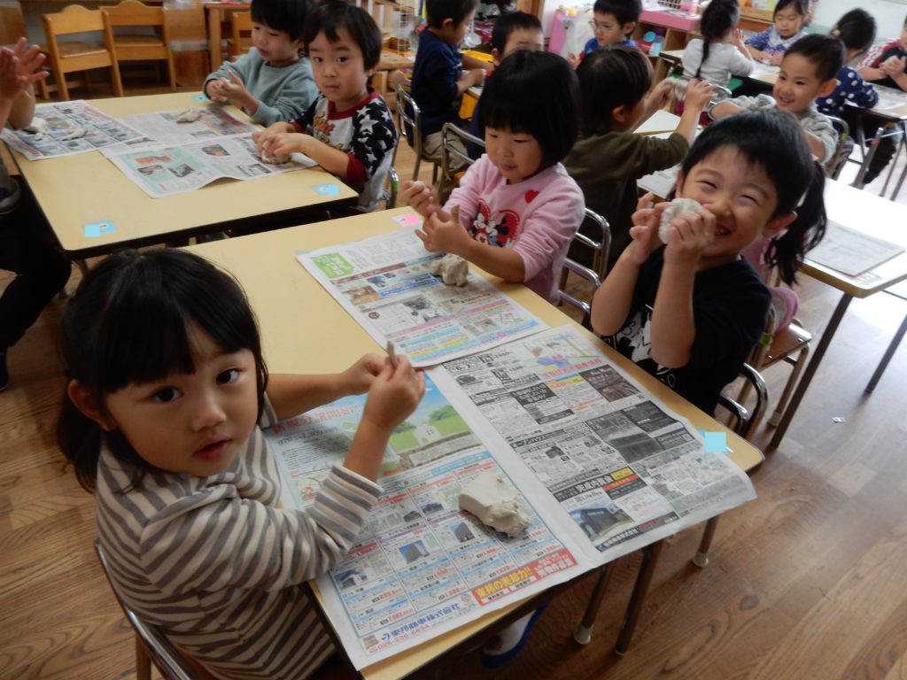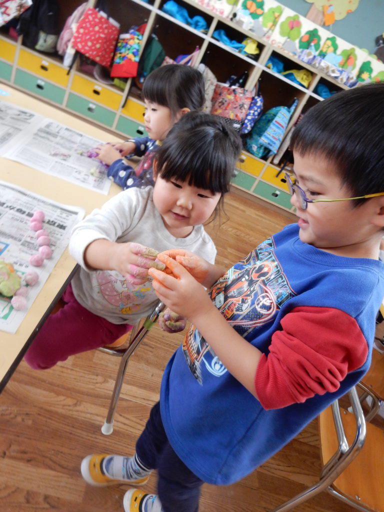 「いつもの粘土と違うねぇ。」と感触の違いを楽しんでいました。