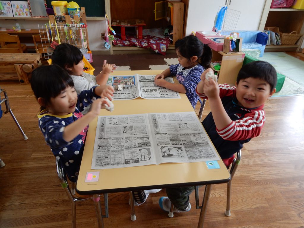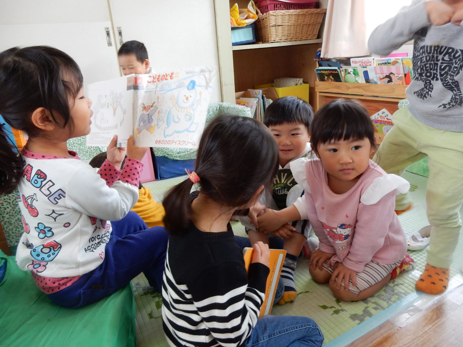 「紙芝居だぁ!」と他の子も集まってきて、先生役と子ども役に。かわいい光景でした。
