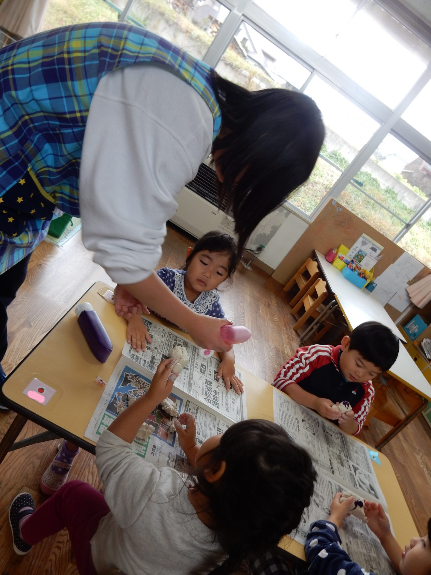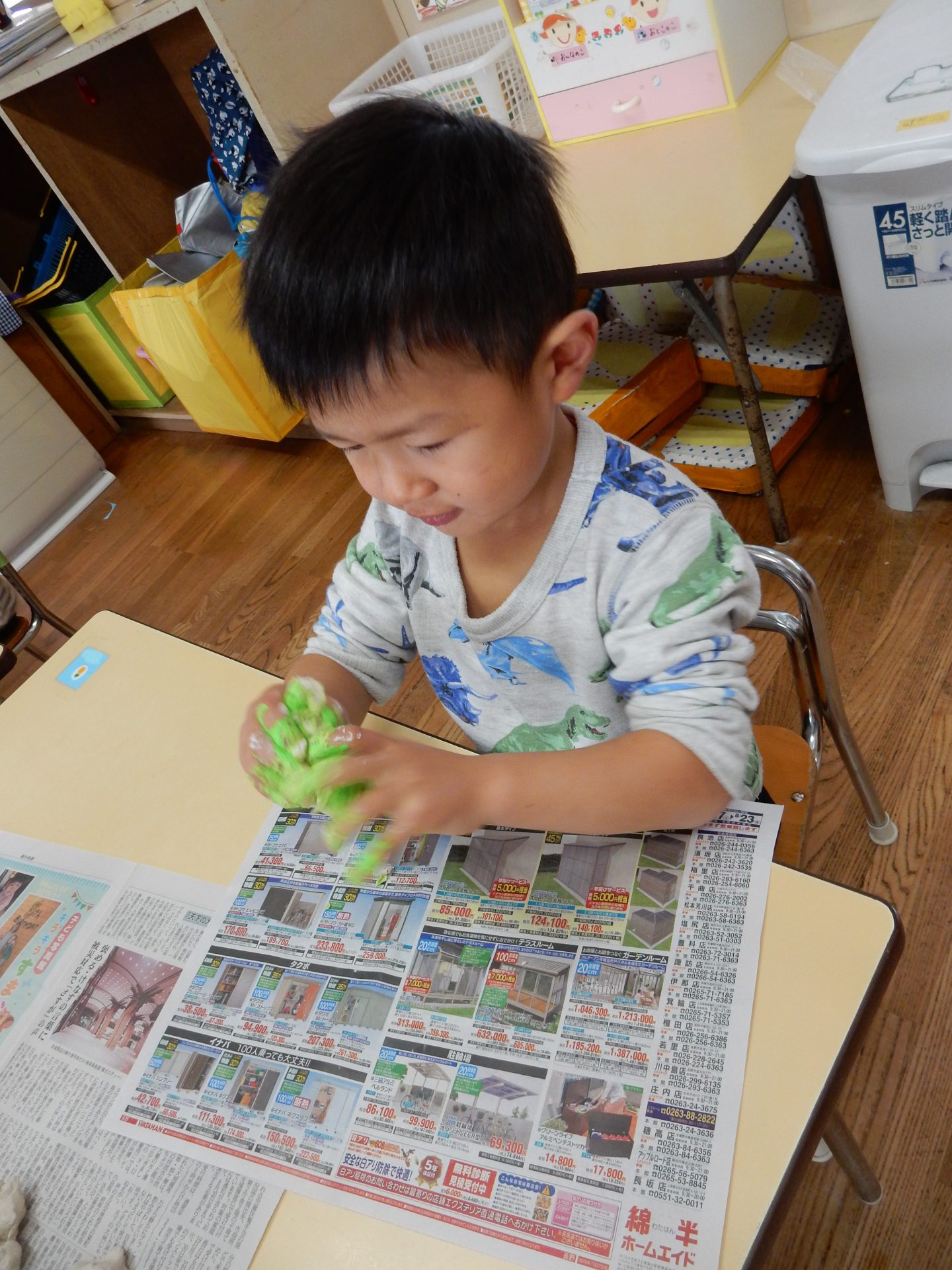 「いつもの粘土と違うねぇ。」と感触の違いを楽しんでいました。