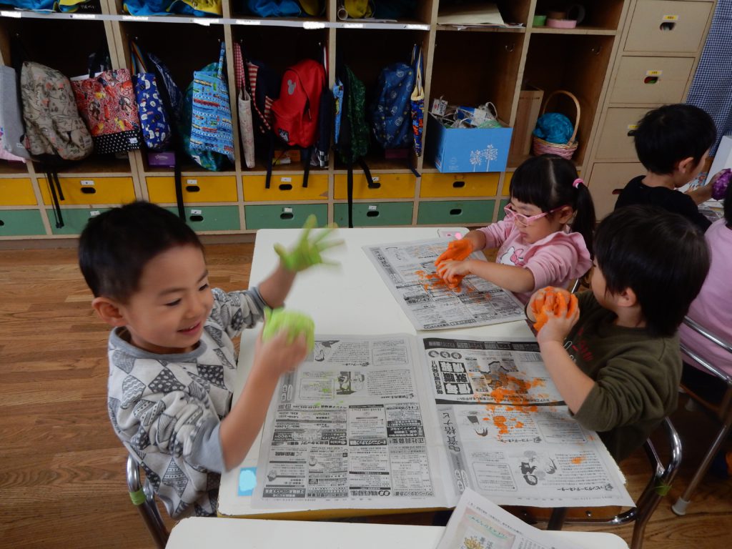 そのうち、「年中さんの使ってたのは色が付いてたよ??」という子が。「どうやって色が付いたんだろうね?」と考えていると、ちゃんと年中さんを見ていた子がいました。「絵の具を入れてたんだよ!だって粘土の近くに絵の具が置いてあったもん!」よく観察していたんだなぁ、と驚きました。