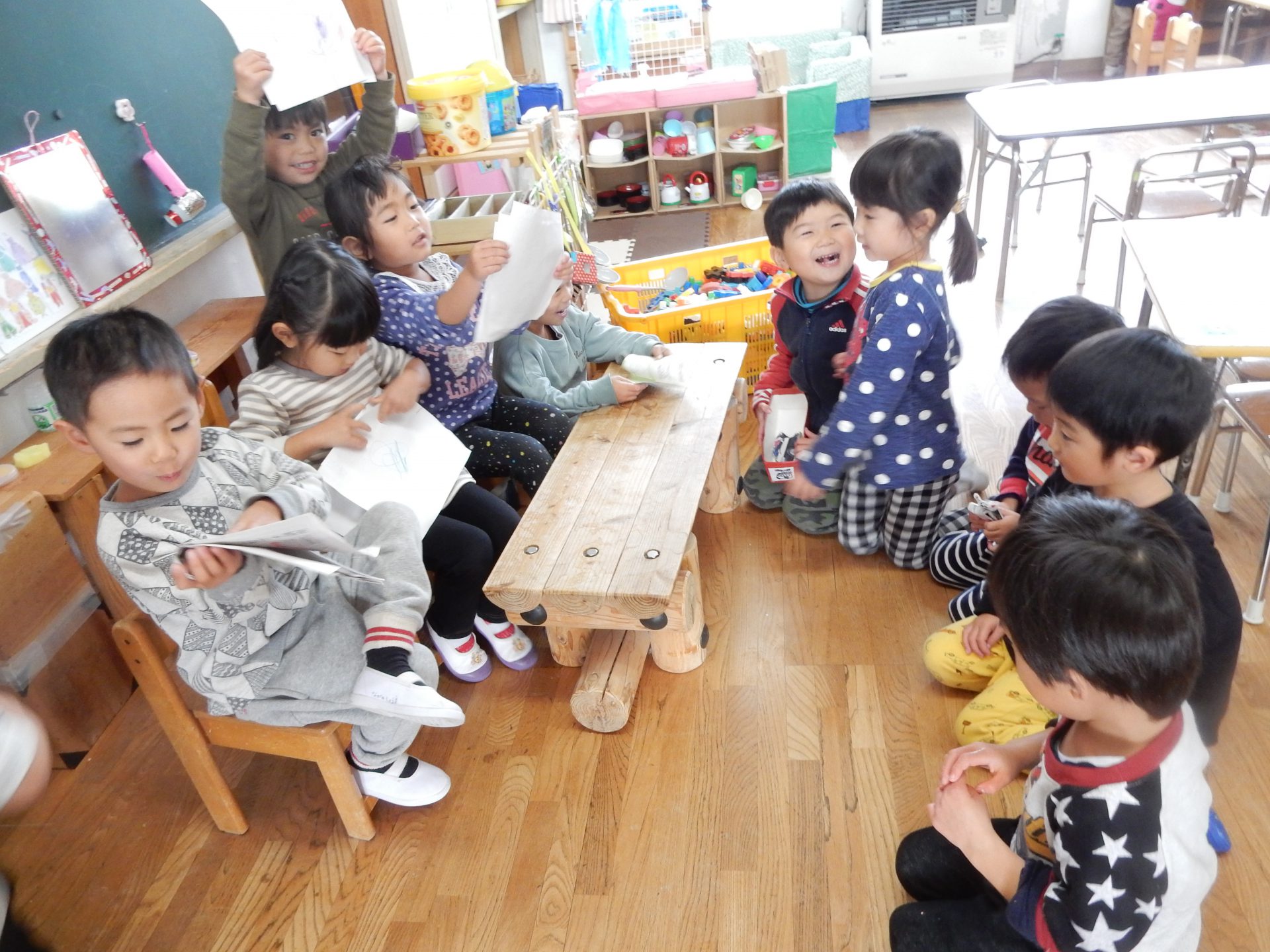 そして「先生は紙芝居も読んでくれるよね。」と何枚かの紙に絵を描き、自作の紙芝居を作っていました。まだ文章はなく絵だけでしたが、なんとなく自分でお話をしながら真似っこしていました。