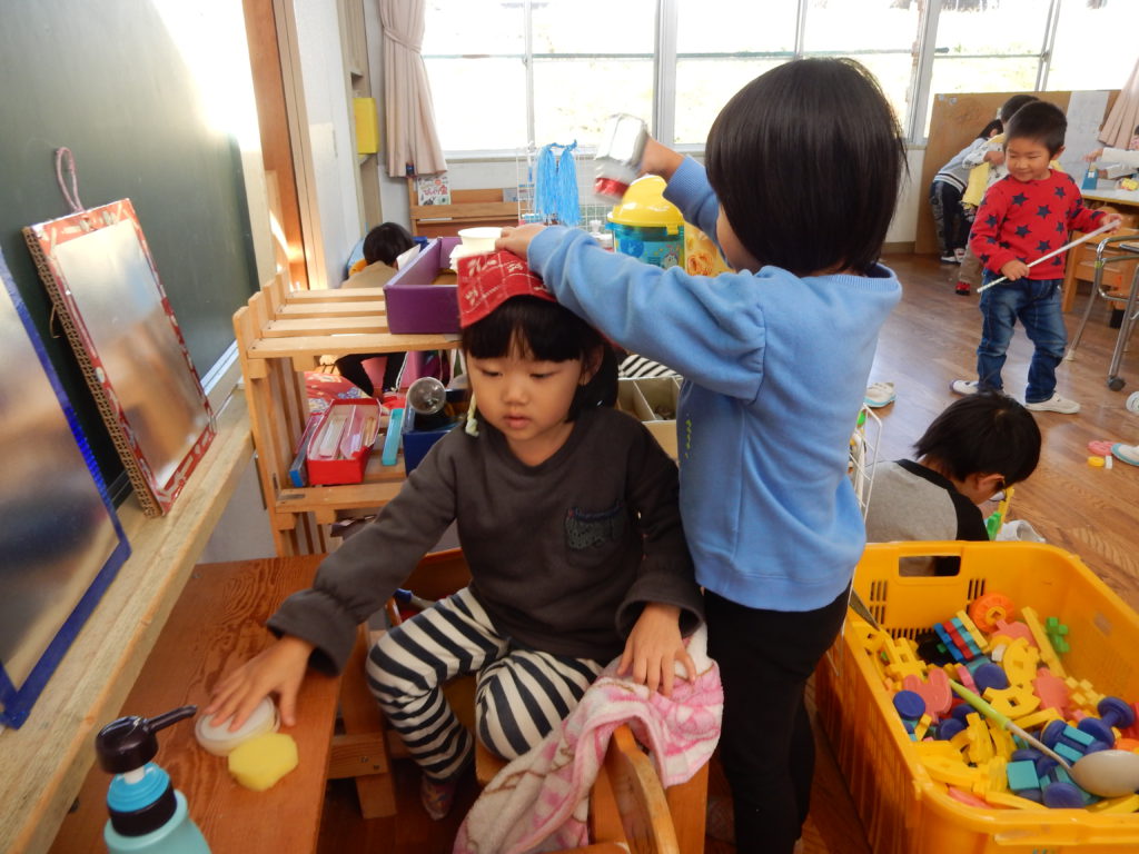 お友だちを呼んできてお客さんに。「頭を洗いますよー。」と美容院に行ったことを思い出して少し寝かせながらシャンプーをしています。終わると髪の毛をタオルで拭いて、ドライヤーで乾かします。よく知っているなぁと感心。