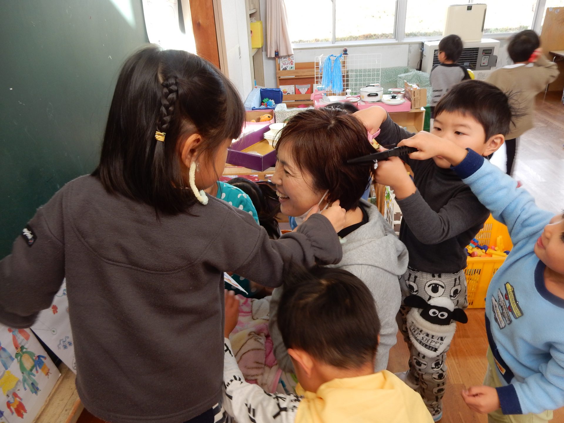 そして、真似っこはまだまだ続きました。お姫様に変身して遊ぶのが好きな女の子。お化粧したい、とお化粧の真似っこをしてしていました。そこから、髪の毛もかわいくしようと、床屋さんごっこになりました。