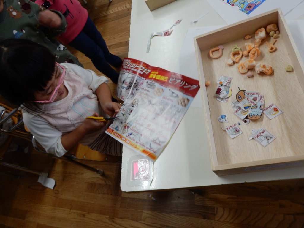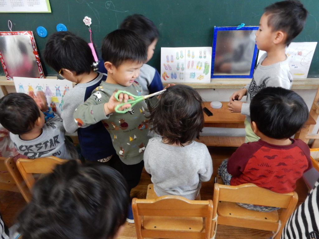 事務室から先生たちを呼んできたり、未満児組のお友だちも呼んできたりと、お客さんを集めてりんご組床屋さんを楽しんでいました。