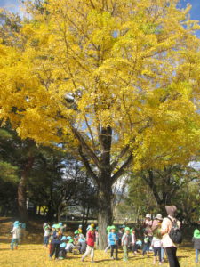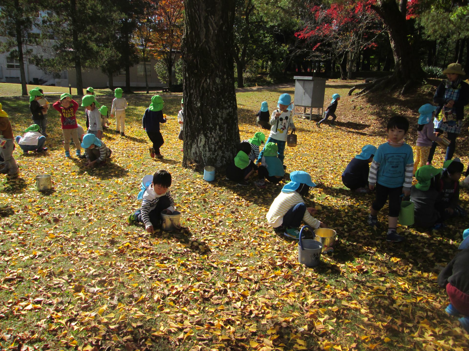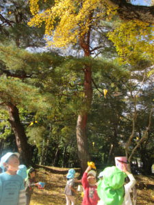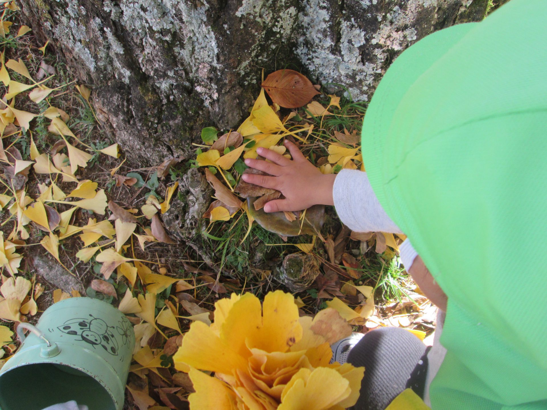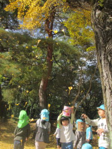子ども達と穂高荘の大銀杏が色づく変化や葉っぱのシャワー等を経験したい思いから、数日お散歩に通い大銀杏の色付き具合を見てきました。四季の変化、木々の色付き具合は毎年同じとは限らないため、保育士が自然に対する興味や知識を持つこと、経験する事象のタイミングを逃さないことも大切だと感じます。
