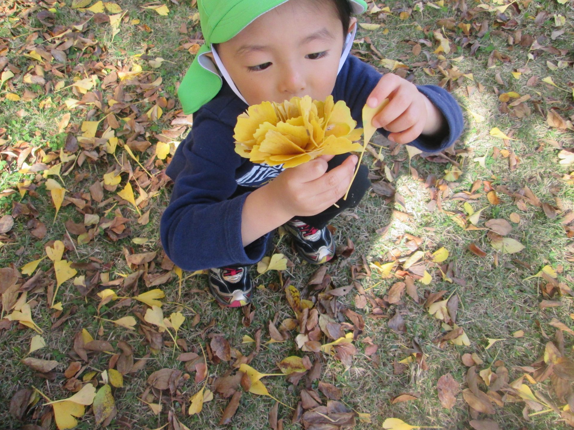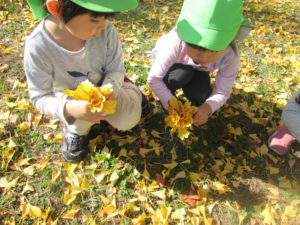 小さな手のひらにいっぱいに銀杏の葉っぱを集めて束ねていくときれいな花束の完成です。