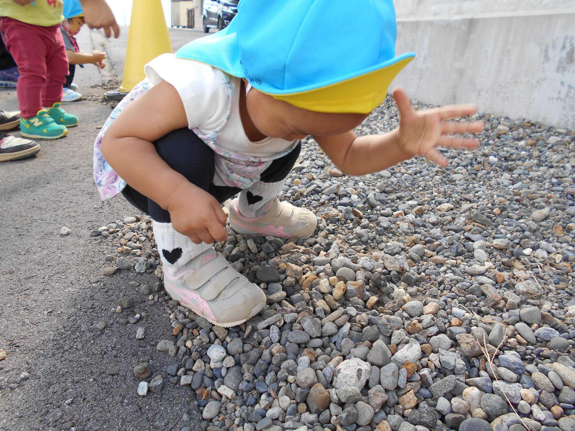 駐車場へ行く道中も遠足です。小石を拾って、落として、踏んでみて、石の音も楽しいね。