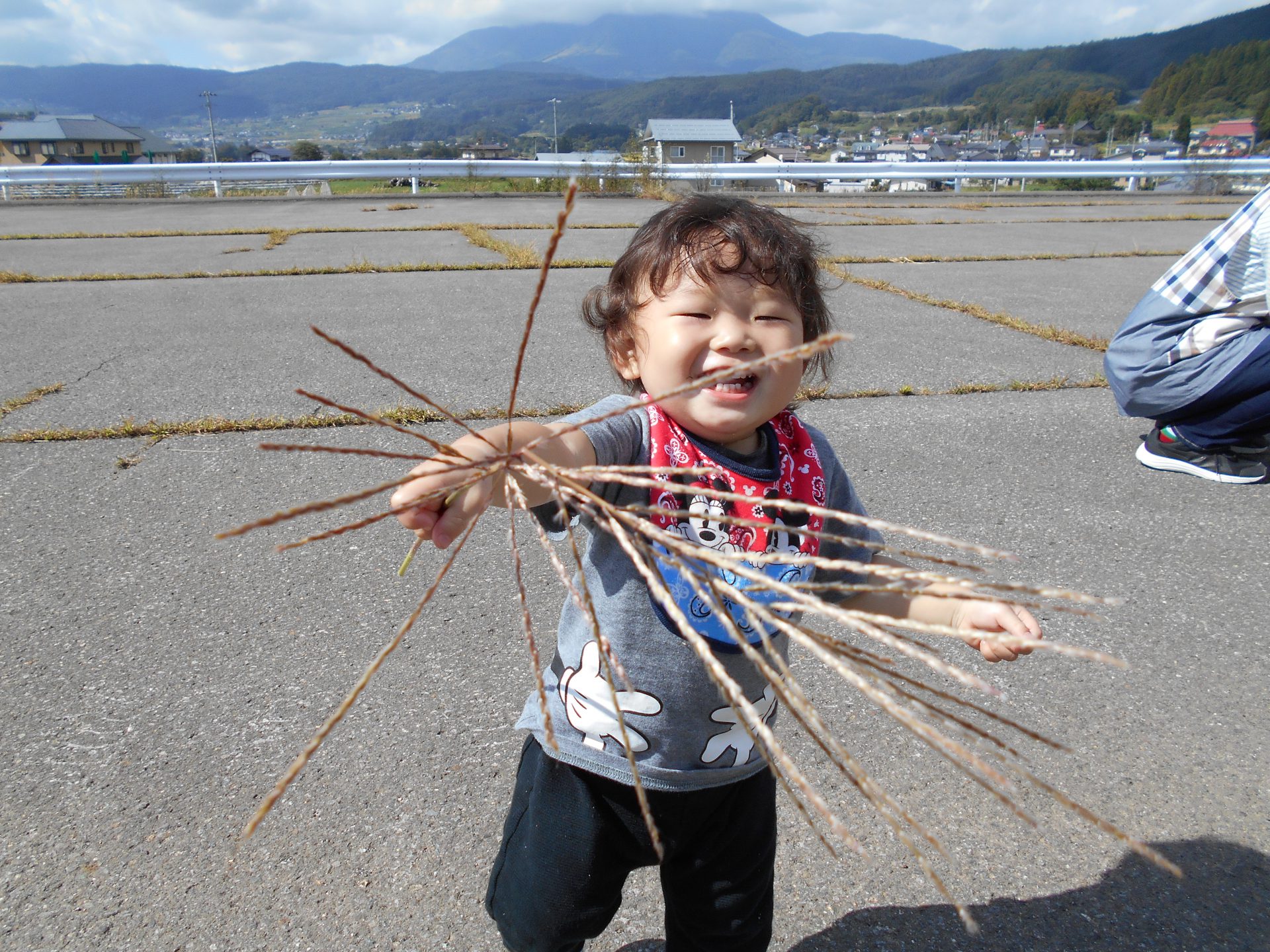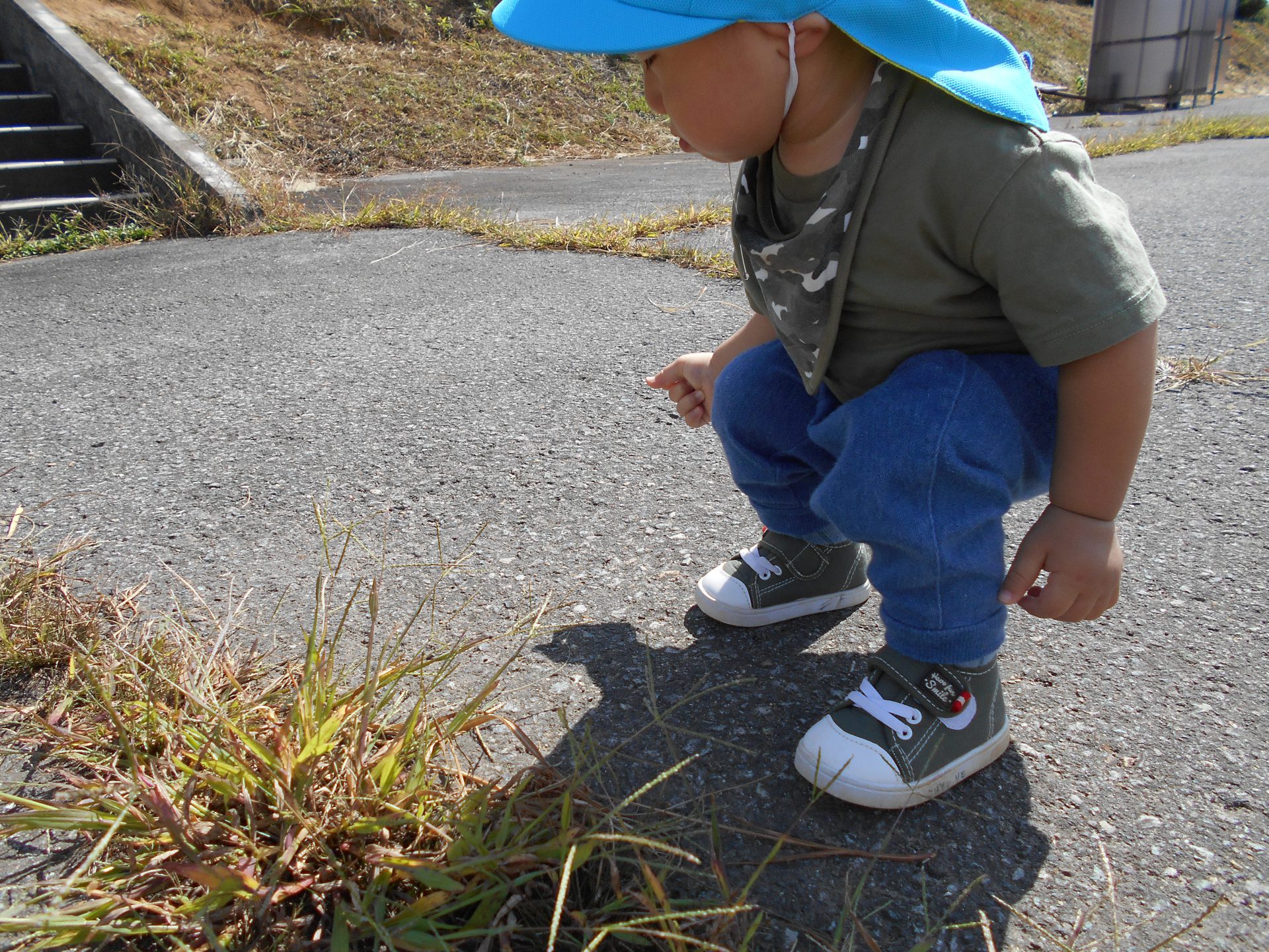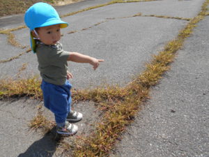 「バッタ」を発見!!「あっあっ」と教えてくれました。とことこ歩いて近づくと、「ピョン」と跳ねて行ってしまいます。一瞬見失ってキョロキョロ、また見つけて「あっあっ」バッタとの追いかけっこを楽しんでいました。