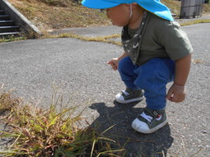 保育者とゆっくり歩くことで石や草、虫や車、鳥などを子ども達が発見し指さしや「あっ」の声があります。いろいろな物に興味を持ち、発見したことを保育者に伝えてくれます。そこから一緒に見たり、触ったり、共感の声掛けをすることで自分を受け止めてもらう喜びや、安心して興味の持ったことに向かっています。これからもそんな経験をたくさん積み重ねていくことができるように見守りたいと思います。