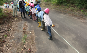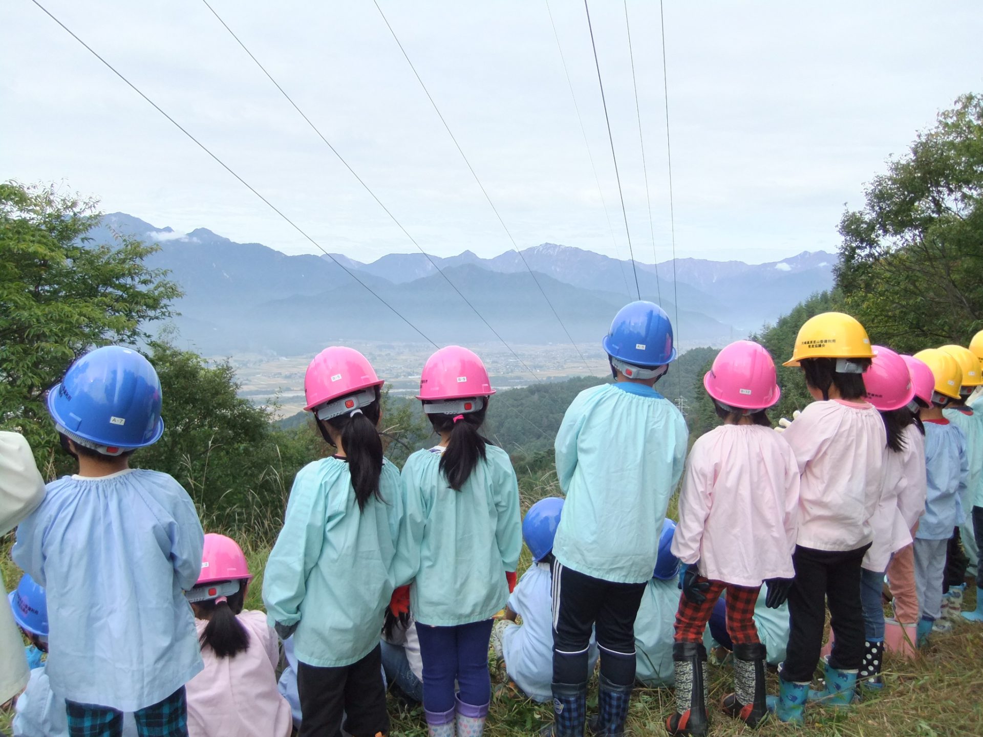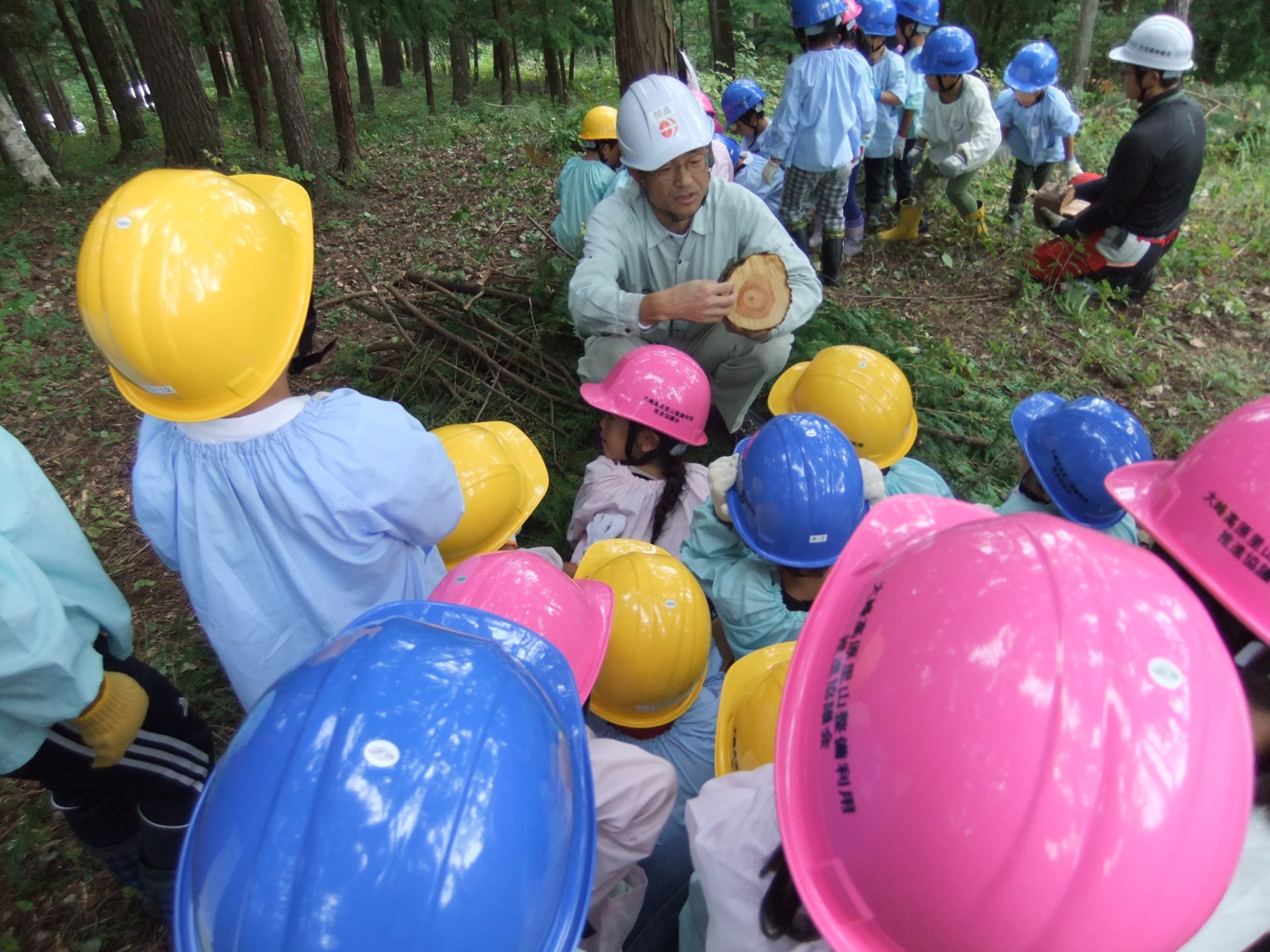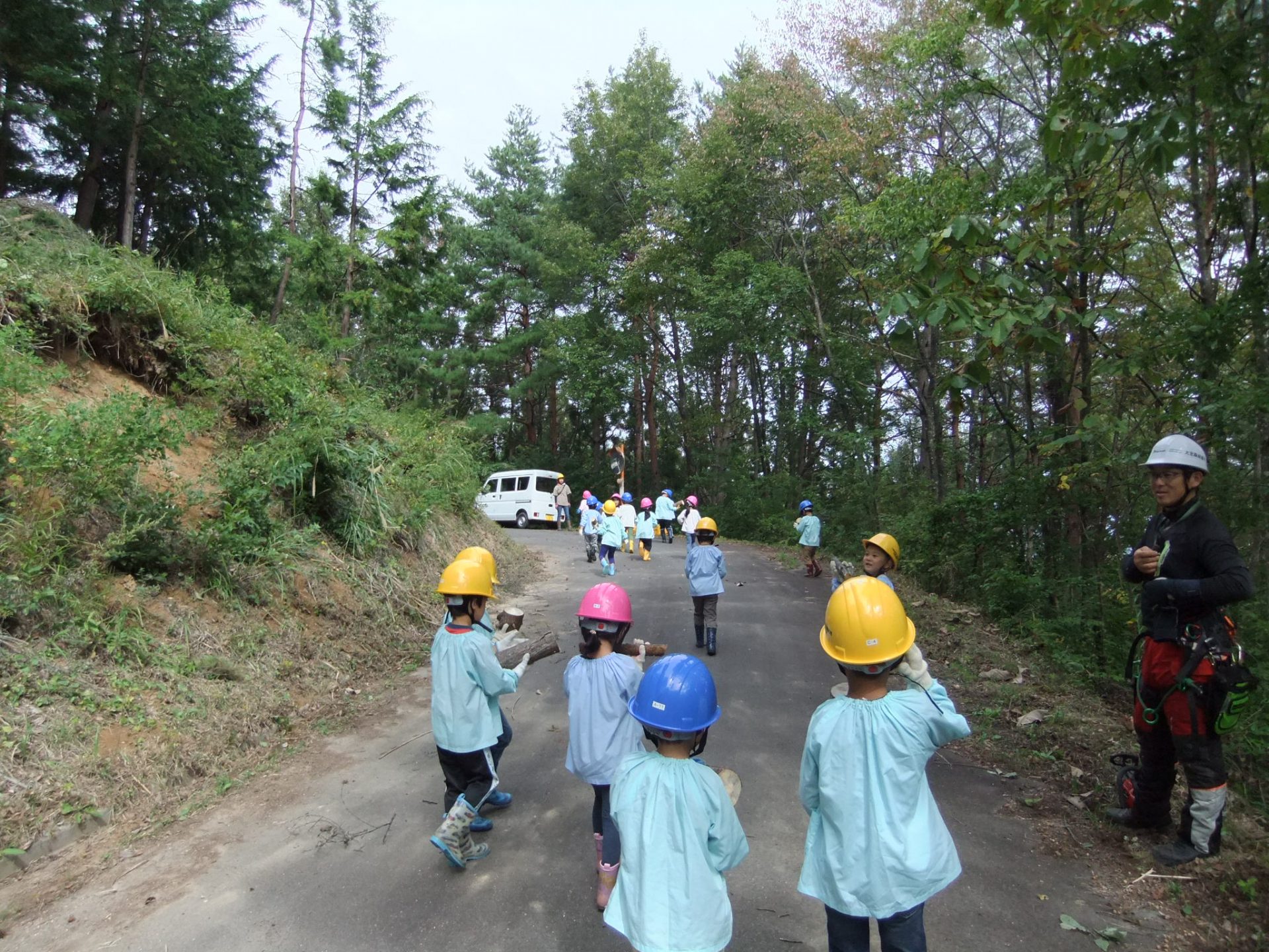 10月9日年長さんは、木育事業の一環で大峰高原を探索してきました。森林組合の方に案内していただき、木についての勉強をしました。木の年輪を数えると木の年齢が分かることや、病気になってしまった木は伐採しなくてはならないことなど実際に木に触れながら教えてもらいました。