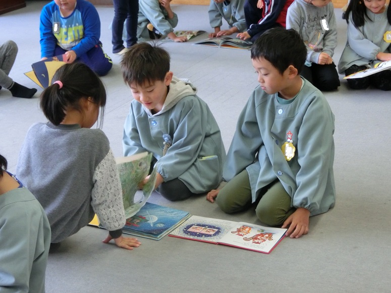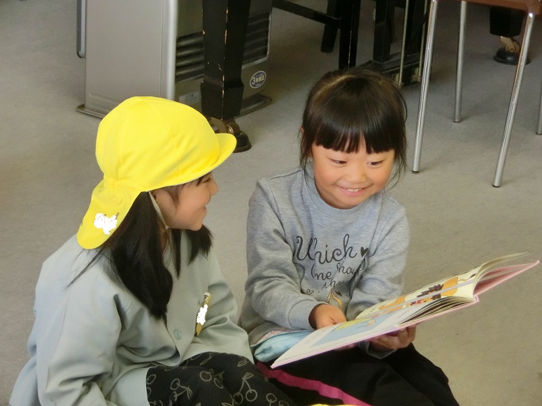 ペアで絵本を見ています。1年生が読み聞かせをしてくれました。