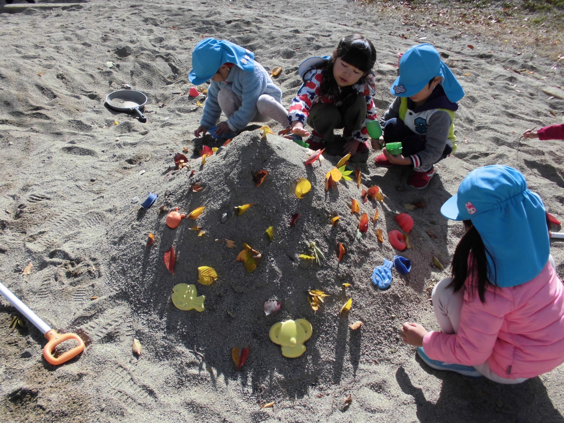 園庭から見える美しいアルプスを指さして、拾った葉っぱを砂山にさし入れていました。