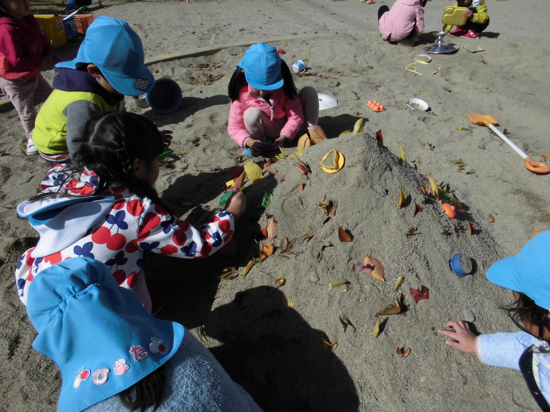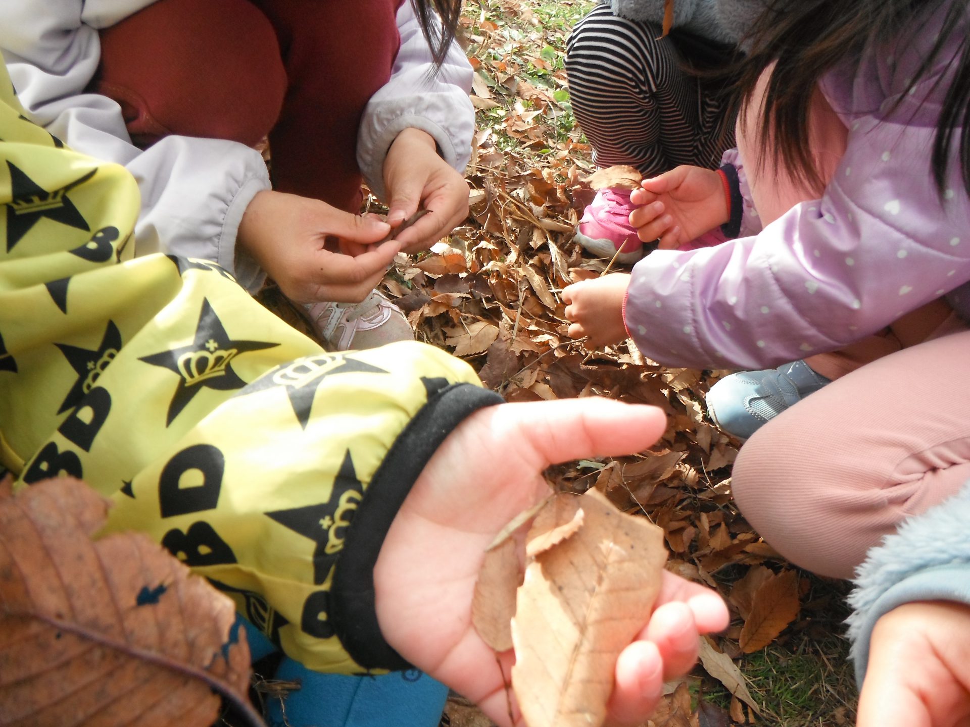 子ども達と園庭の落ち葉拾いをしながら秋や冬を探していました。