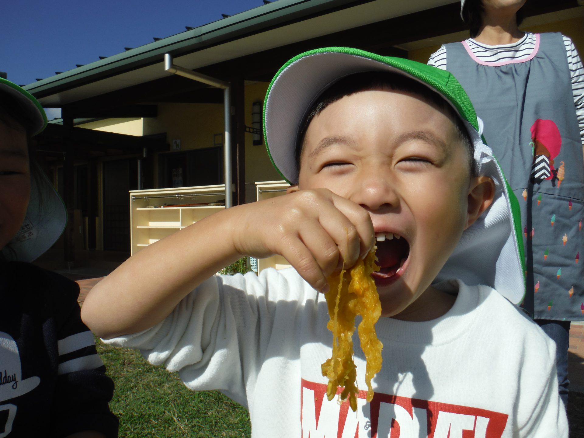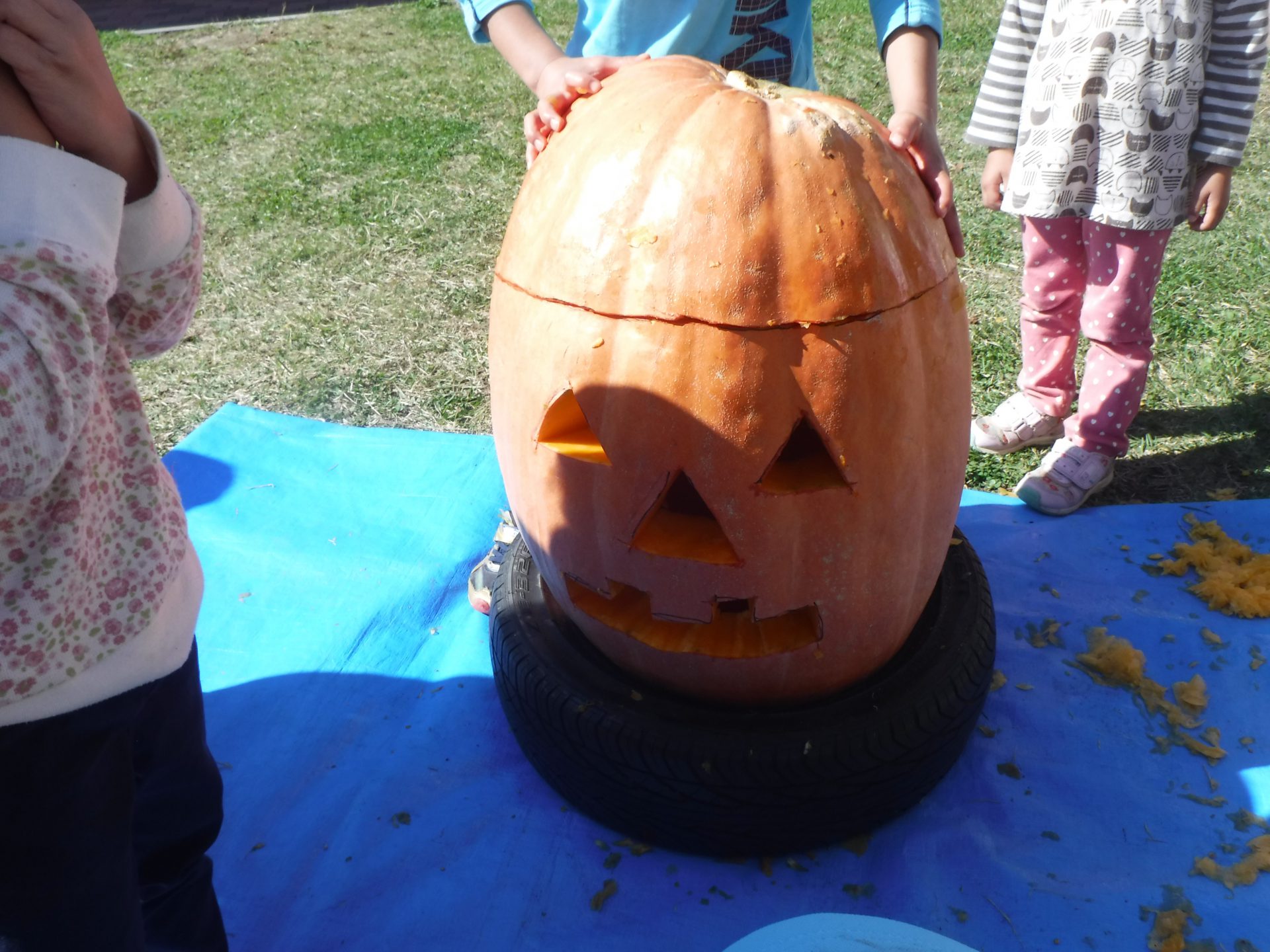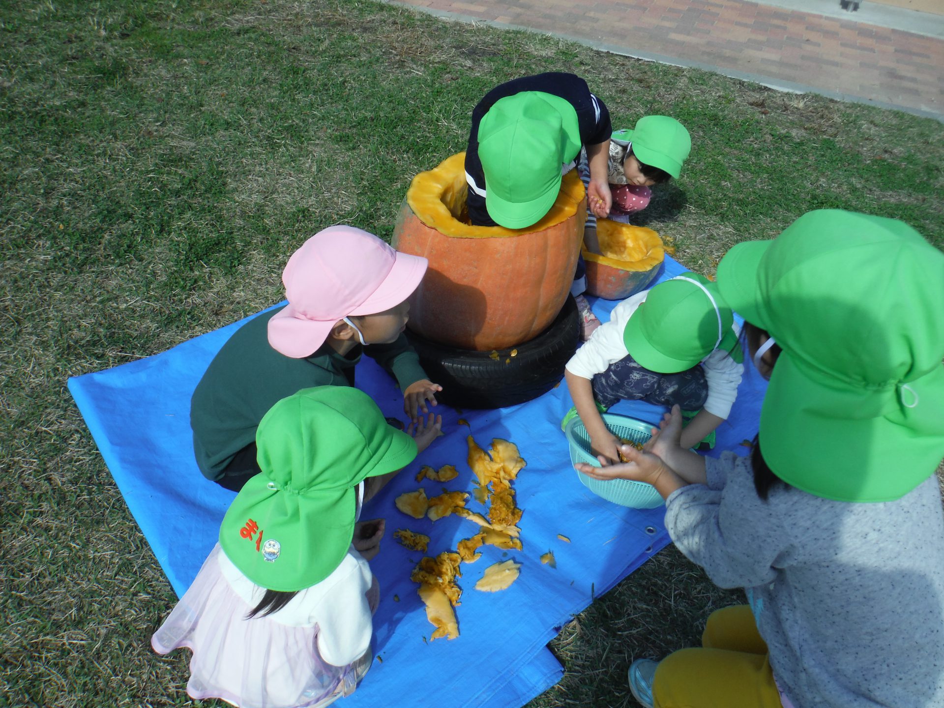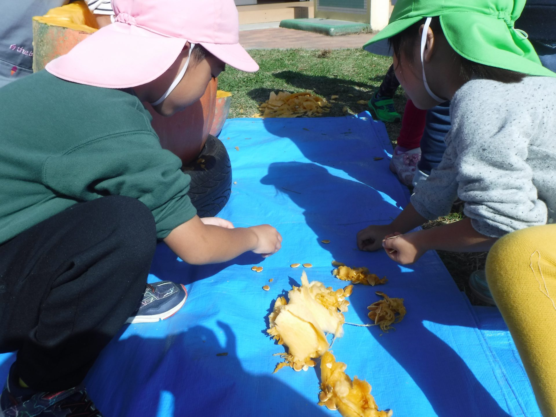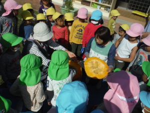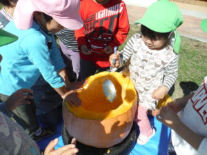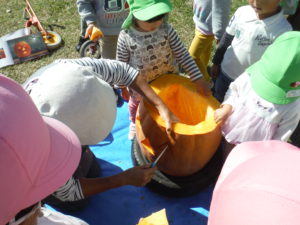 大きなかぼちゃにみんな興味津々で、あそんでいた子どもたちも集まってきて種を取ったり中身をかき出したりお手伝いを張り切ってしてくれました。