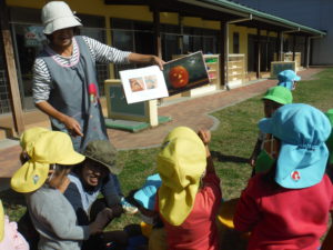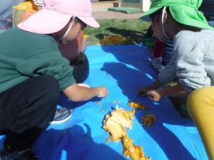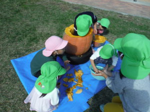 お天気の良い日にハロウィンの絵本に出てくるおばけかぼちゃを園庭でつくることにしました。