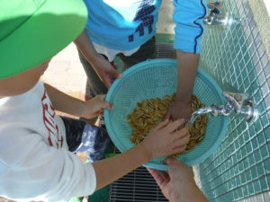 地域の方への感謝の気持ちを持ち種を洗って乾かして「また来年も作ってください」とさつま芋堀の時にみんなで取った種をお返ししました。