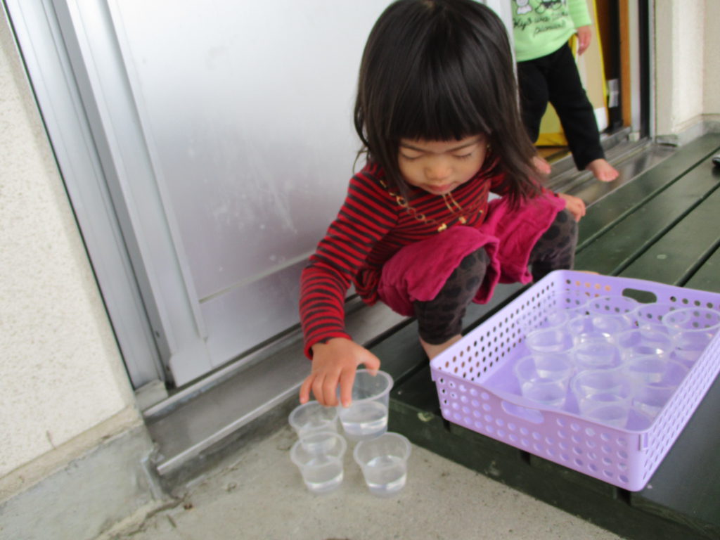 お部屋に帰ってきてから、カップに水を入れて外に置いてみることに。