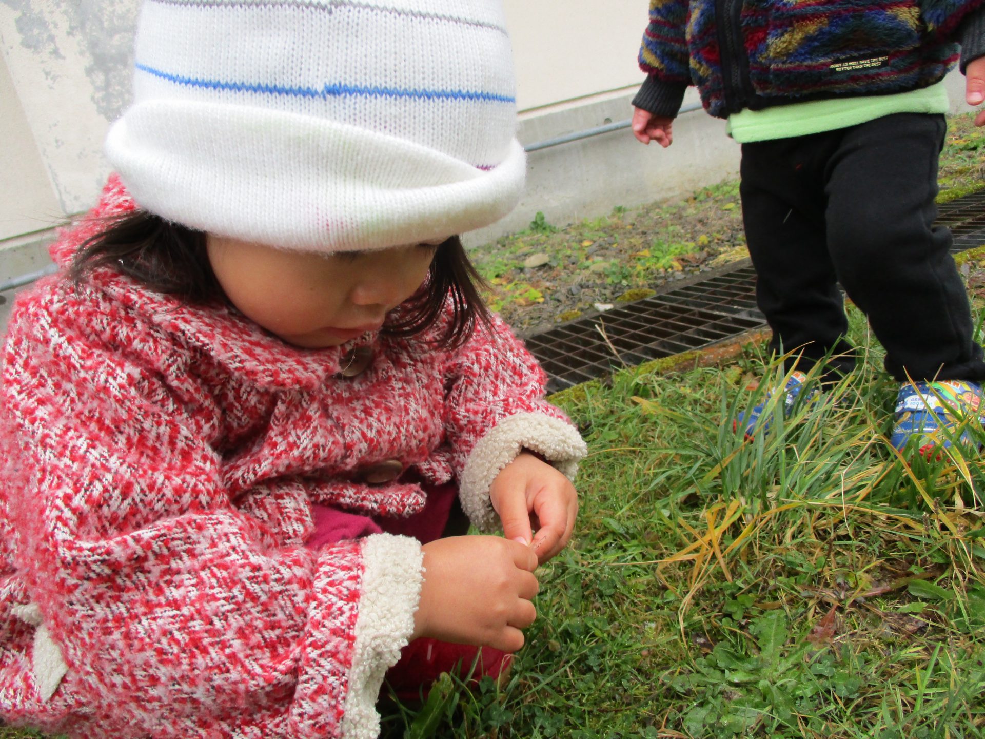 もっと冬の景色がないかな、と園舎裏のわくわく広場に冬探しへ出発!