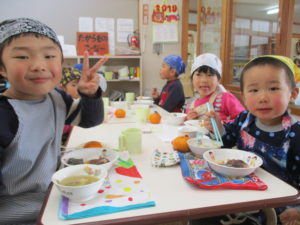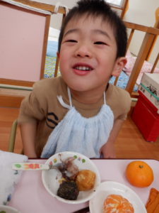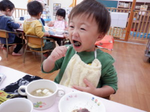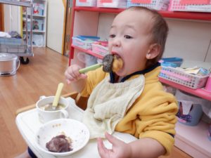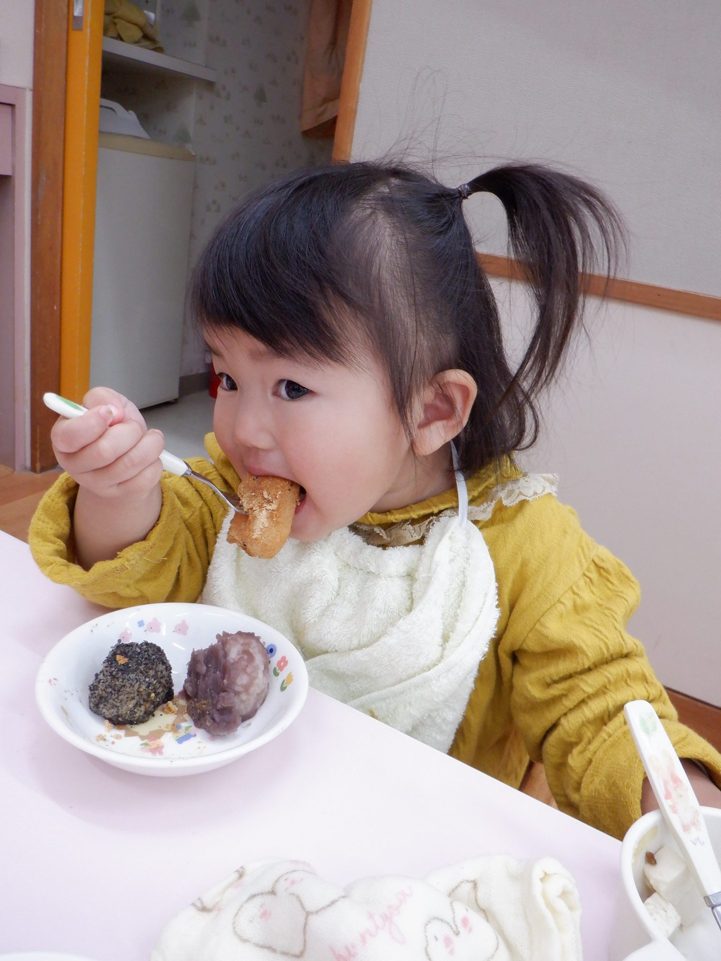 未満児さんは給食の先生に作ってもらったおはぎを「いただきま〜す!」