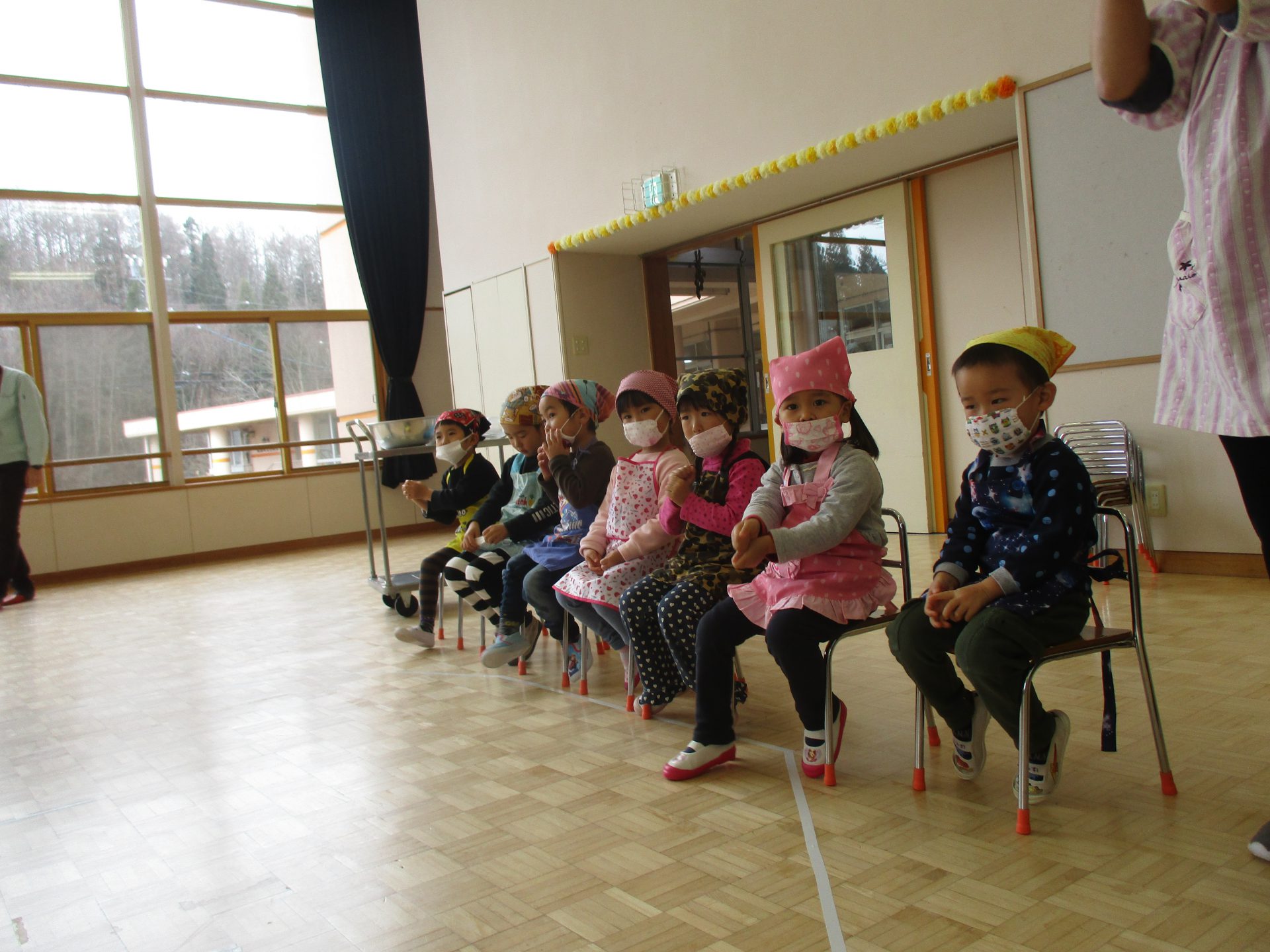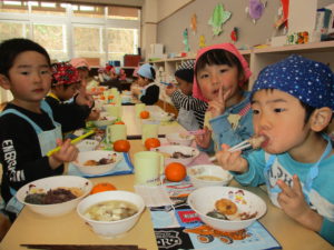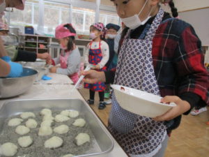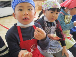 年少・年中・年長さんは、つきたてのお餅を給食の先生にちぎってもらい自分で味付け。