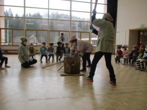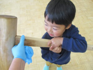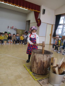 お餅がつき終わった後、保育士が使っていた杵をちょっぴり拝借。