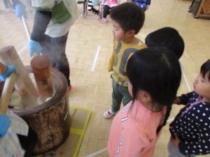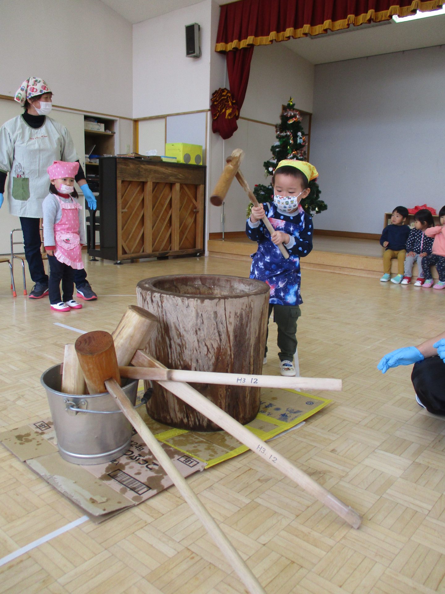 保育園では子どもたちに季節ならではの行事や伝統に触れたり、普段食べている食事への興味をより深めたりしてほしいと、毎年こうして餅つき会を行っています。