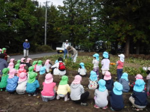 みんなでさつまいも掘りのやり方をきいて、おいも掘りはじめ!